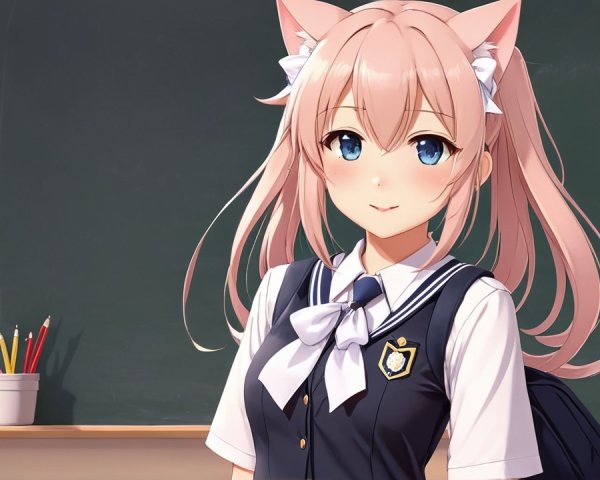 A charming anime girl dons a vibrant fractal-patterned swimsuit, showcasing a blend of colorful geometric designs. Her playful expression and lively pose capture a sense of fun and summer joy.