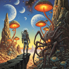 A lone astronaut stands on a rocky ledge, gazing at towering mushroom-like structures under a vibrant sky filled with multiple moons, while a menacing creature looms nearby.