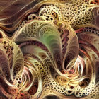 The image depicts a fantastical, intricately designed stone interior with sweeping arches and whimsical architecture. Two figures converse in a lively, surreal setting, while a third observes.