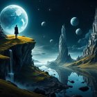A lone figure stands on a cliff, gazing at a majestic castle nestled among towering mountains. A colossal planet looms in the sky, casting an ethereal glow over the enchanting landscape.