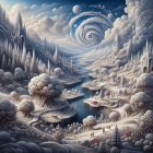 A surreal landscape features majestic mountains and elaborate castles, surrounded by a serene river. The scene is cloaked in a blanket of white, with whimsical trees and celestial bodies above.
