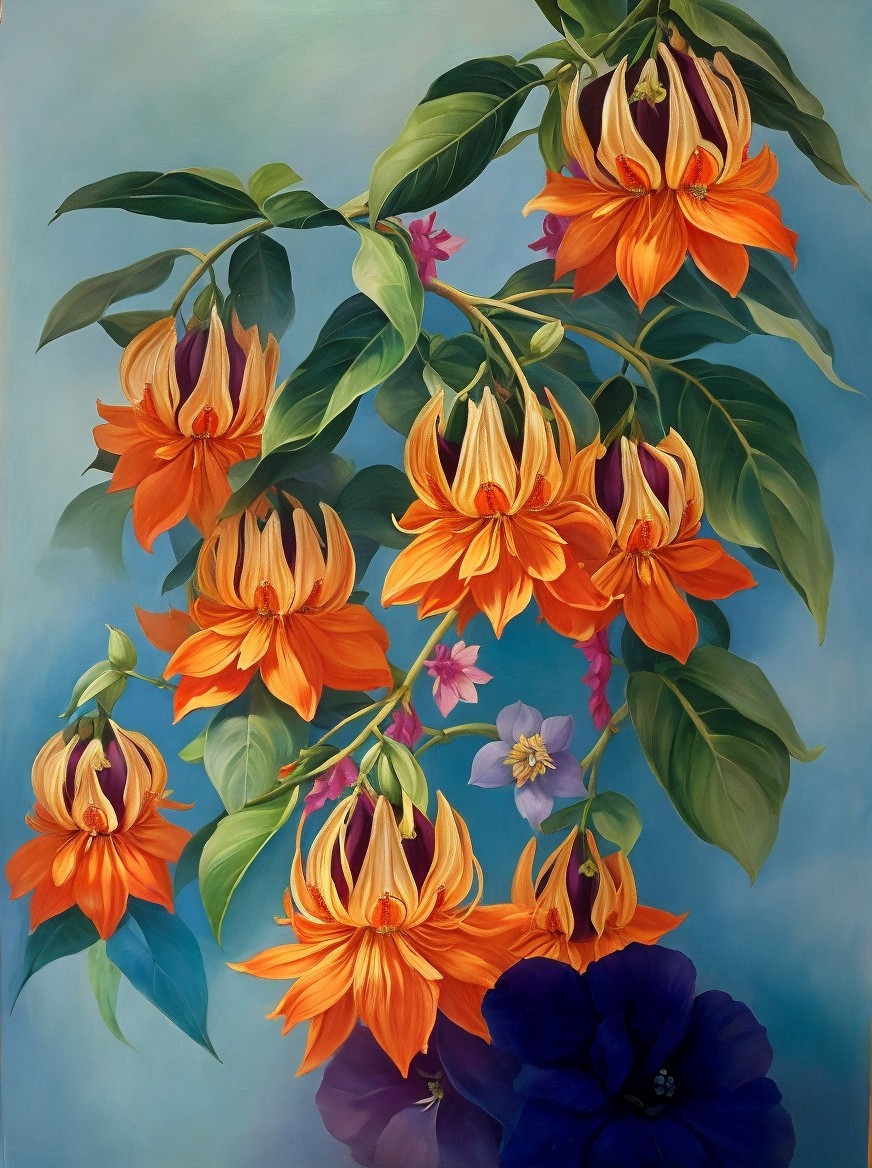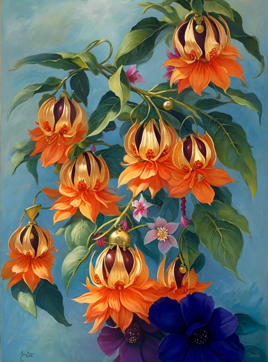 Vibrant Orange and Purple Flower Painting with Gold Details