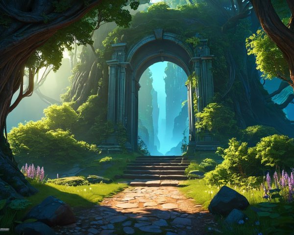A vibrant landscape at sunrise, featuring blooming trees and colorful flowers in a meadow. The sky is illuminated with warm hues, creating a magical, serene atmosphere.