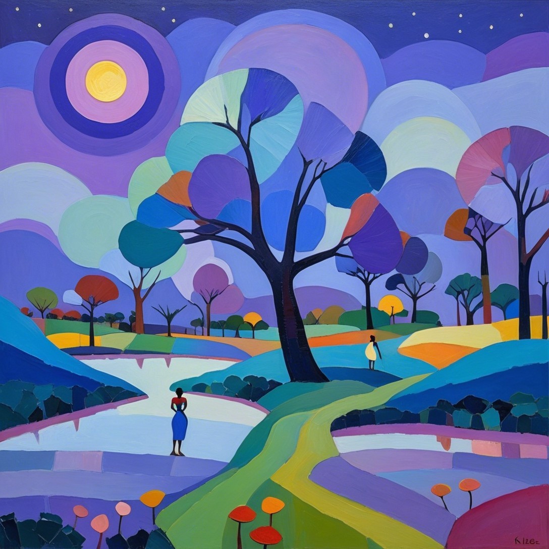 A vibrant landscape features abstract trees and hills in vivid colors. Circular shapes represent a colorful sky with playful hues, creating a serene and whimsical atmosphere.