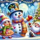 A cheerful winter scene features a smiling snowman, a girl in a colorful outfit, and Santa Claus amidst snowy trees, festive lights, and a bright moon, capturing the joy of the holiday season.