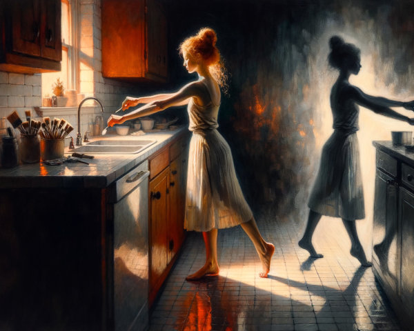 Monochrome sketch of a woman with intense gaze, flowing hair, and expressive shading.