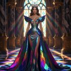 A regal figure stands in an opulent setting, wearing a stunning, iridescent gown with dramatic sleeves and a high slit. Light shines through stained glass, creating a rainbow effect around her.
