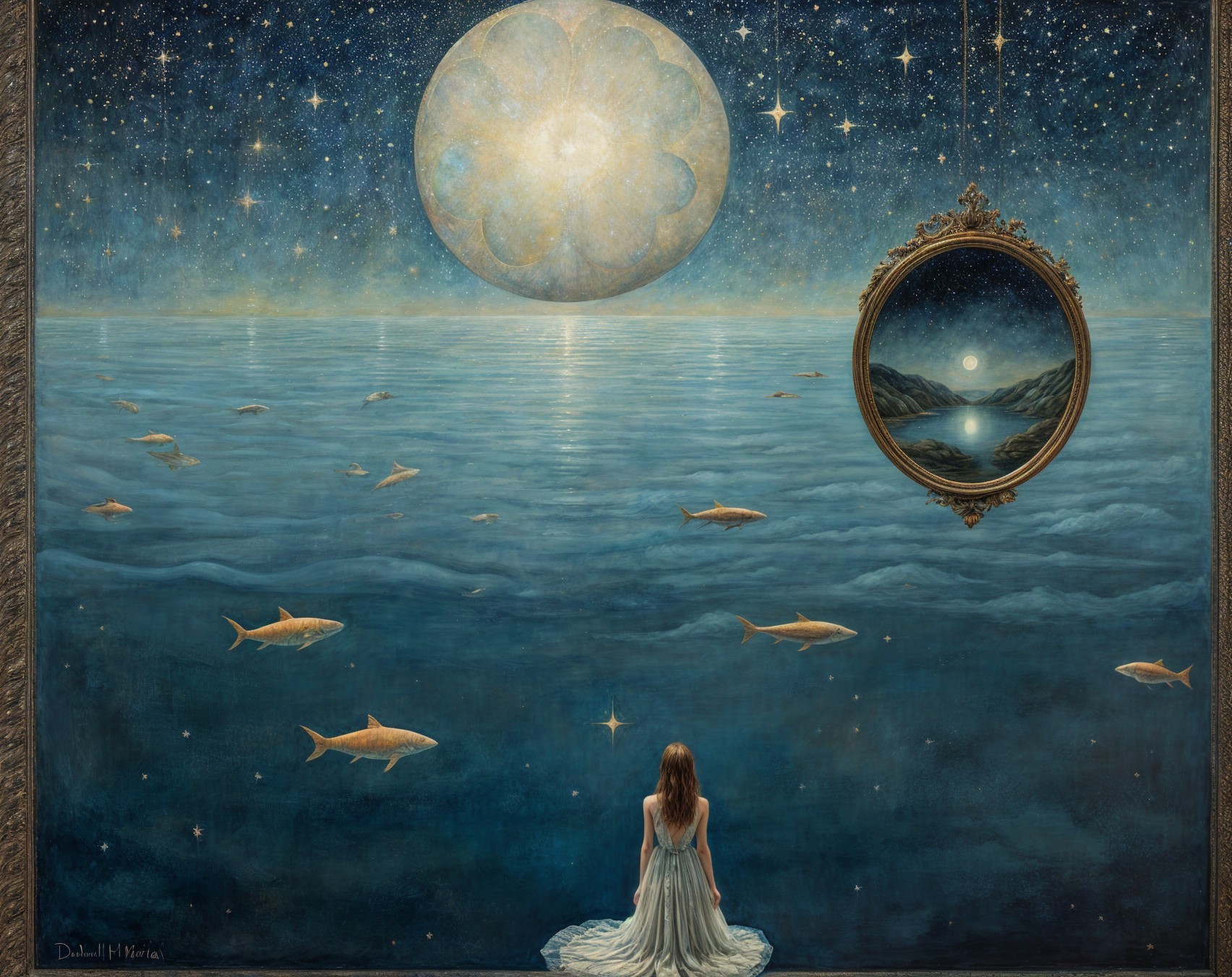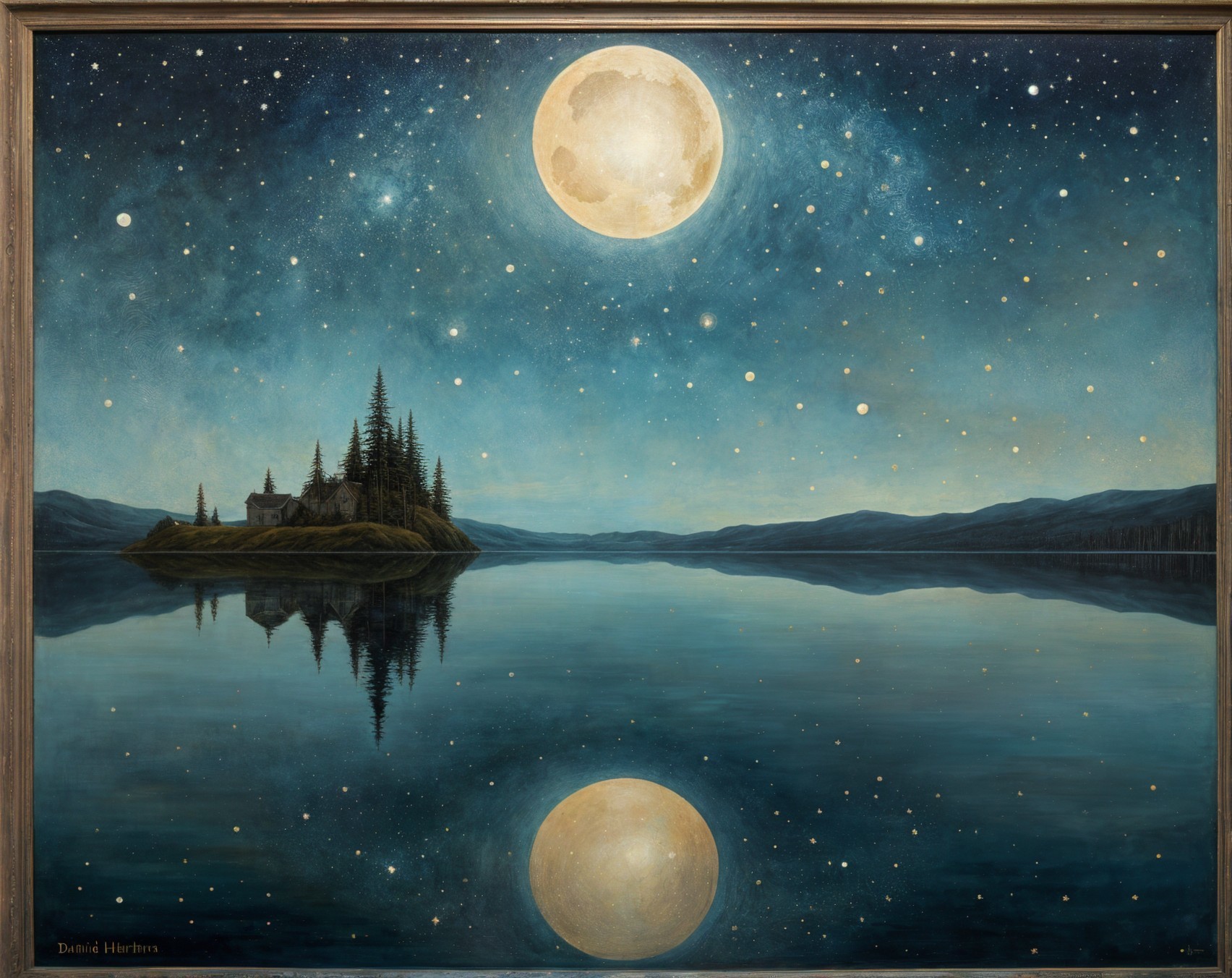 A serene landscape painting features a calm lake reflecting a full moon and twinkling stars, with a small island of pine trees. Soft clouds hover in a starry night sky, evoking tranquility.