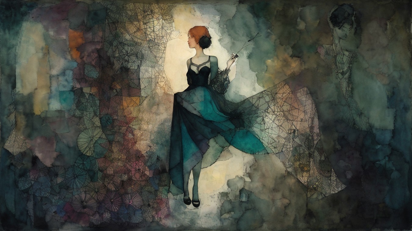 A contemplative figure sits gracefully, adorned in a delicate lace collar and vintage attire. Soft colors and abstract geometric patterns create an ethereal, dreamlike atmosphere.