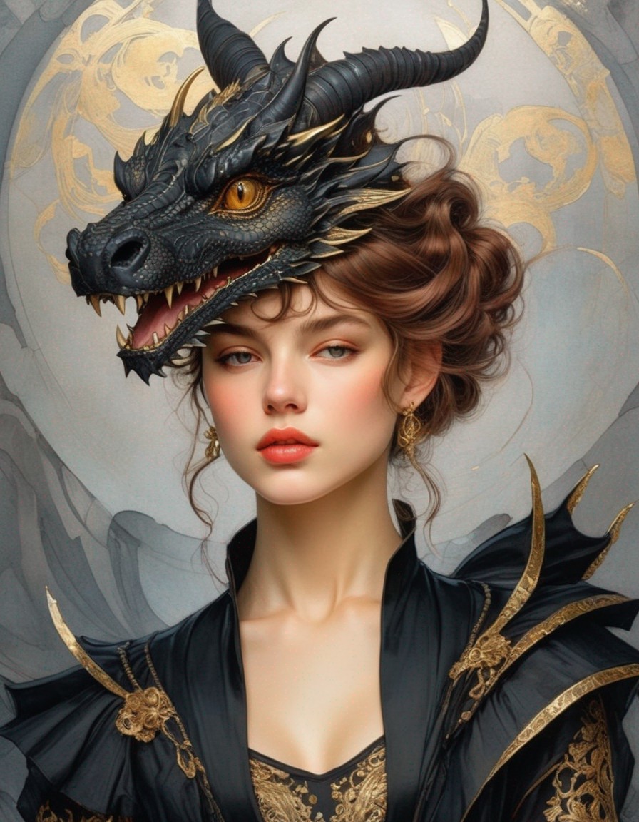 Prompt: Fantastic black and gold dragon. gold foil detail