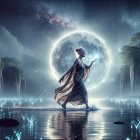A serene woman stands by a glowing lake, wearing a flowing gown that sparkles like stars. The moonlight casts a mystical glow, illuminating lush mountains and luminous flowers around her.