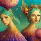 Two ethereal women with flowing blue hair and intricate accessories are surrounded by vibrant hot air balloons. The backdrop features a mesmerizing blend of turquoise and orange hues, evoking a dreamlike atmosphere.