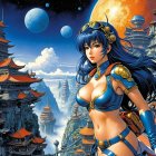 A beautiful woman in a red dress is foregrounded against a scenic landscape with mountains and traditional architecture. Her long hair flows elegantly, enhancing the serene and captivating backdrop.