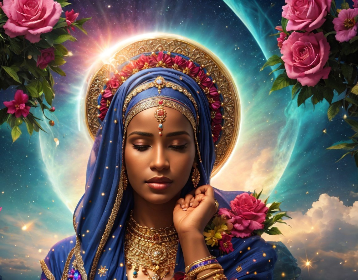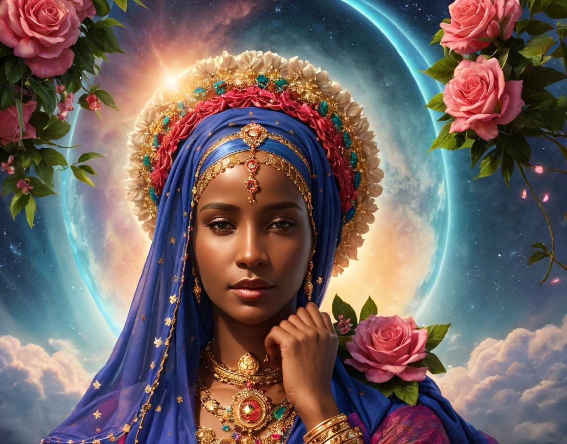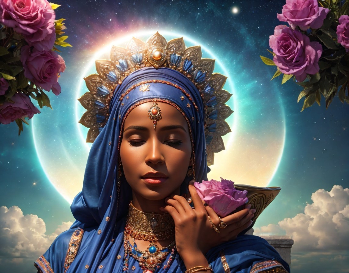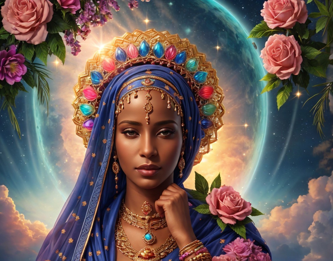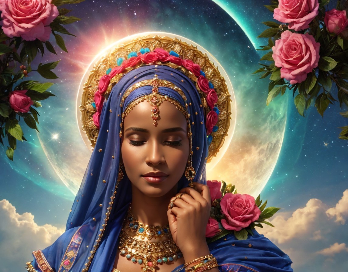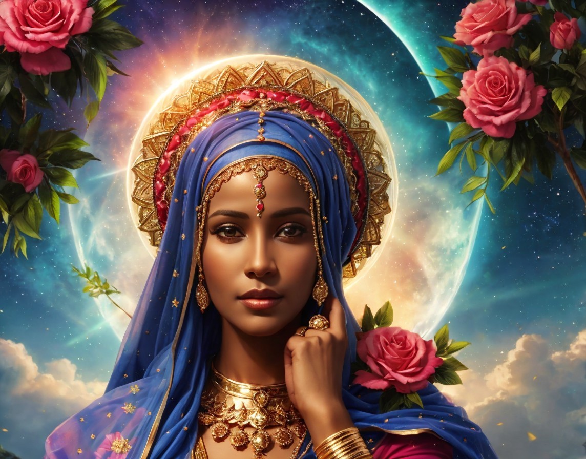 An illustration of a woman with a golden crown and jewelry, draped in blue, surrounded by roses and butterflies against a celestial background.