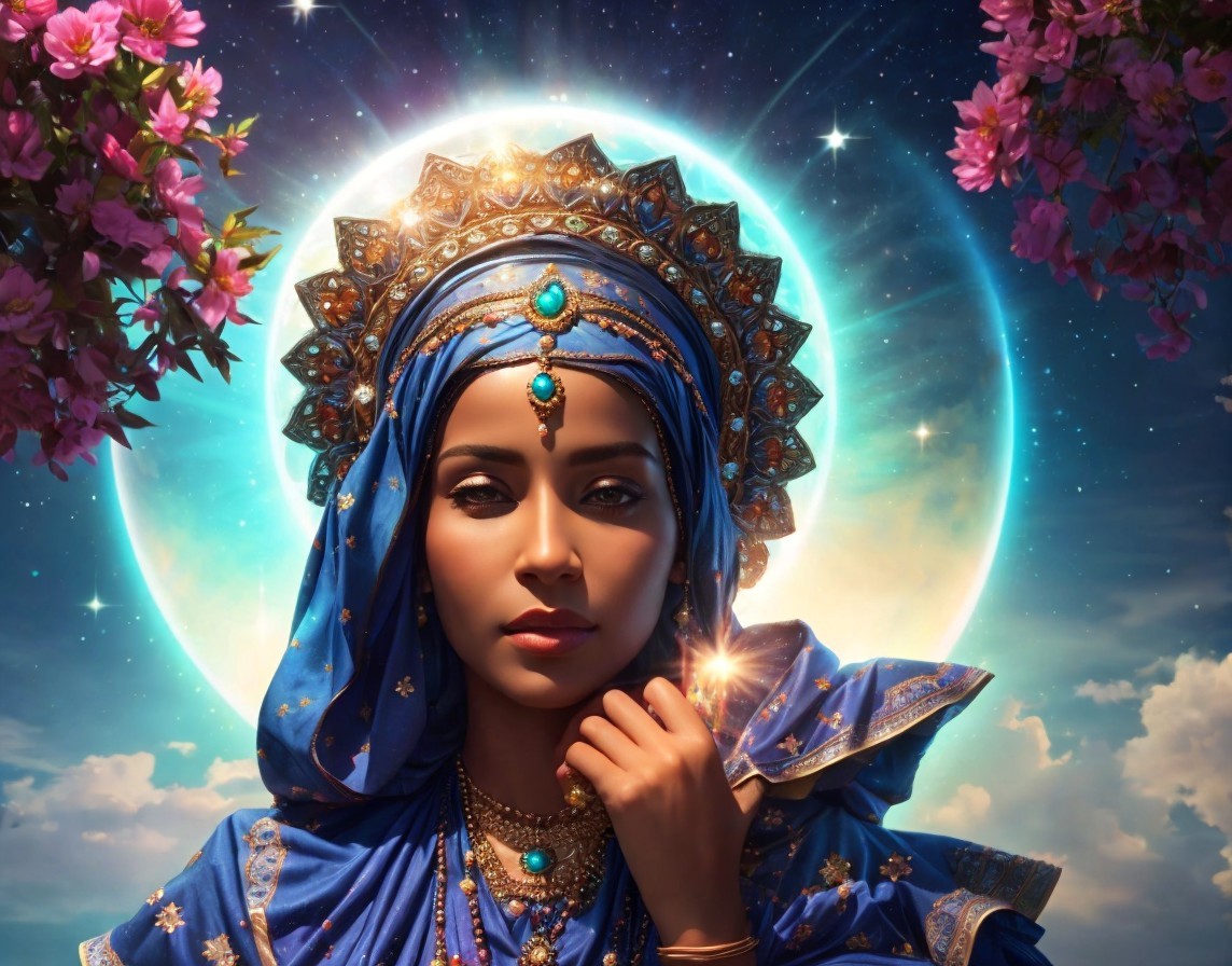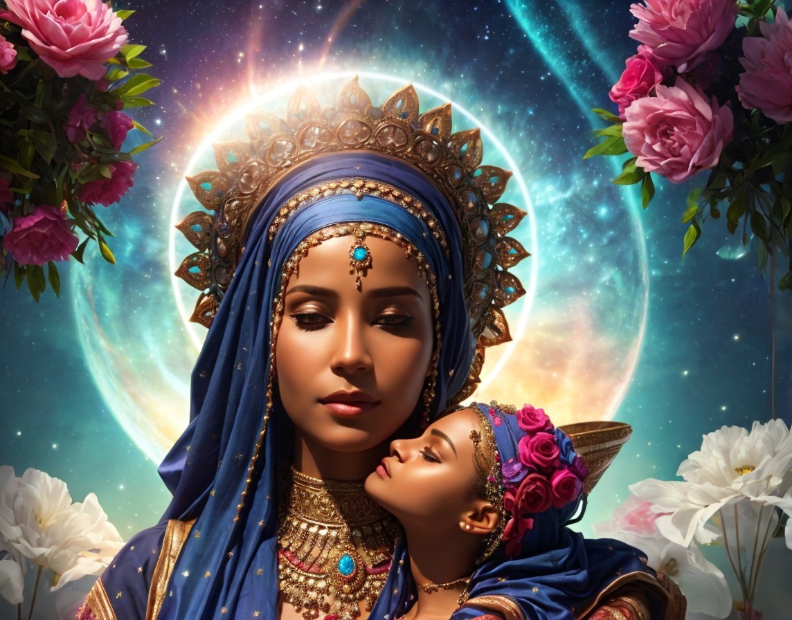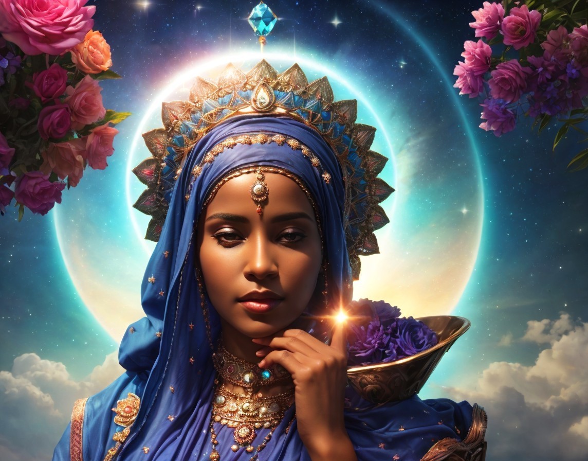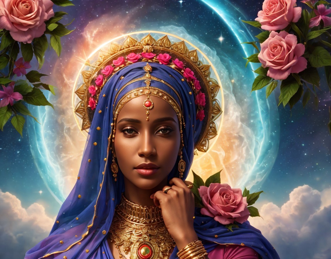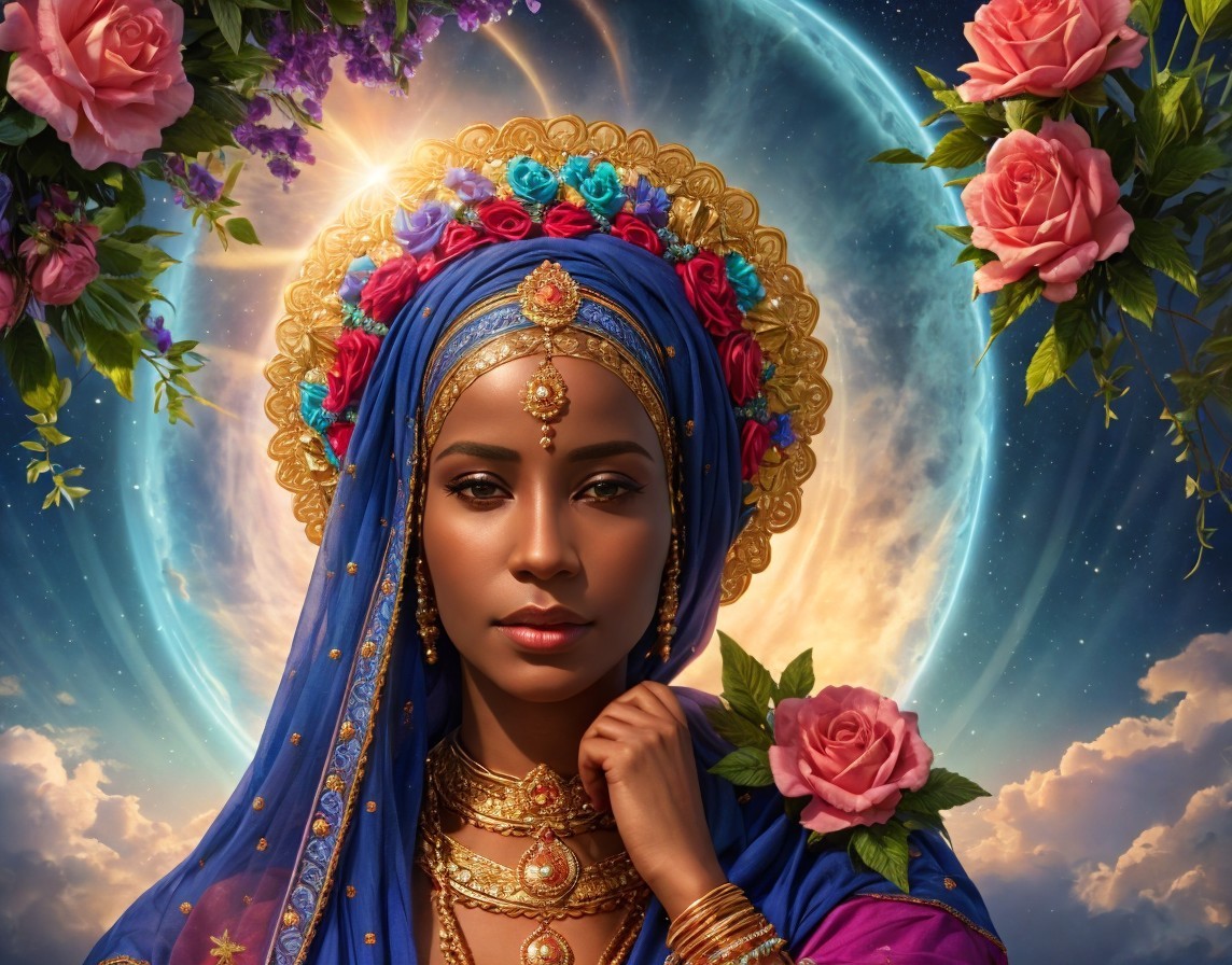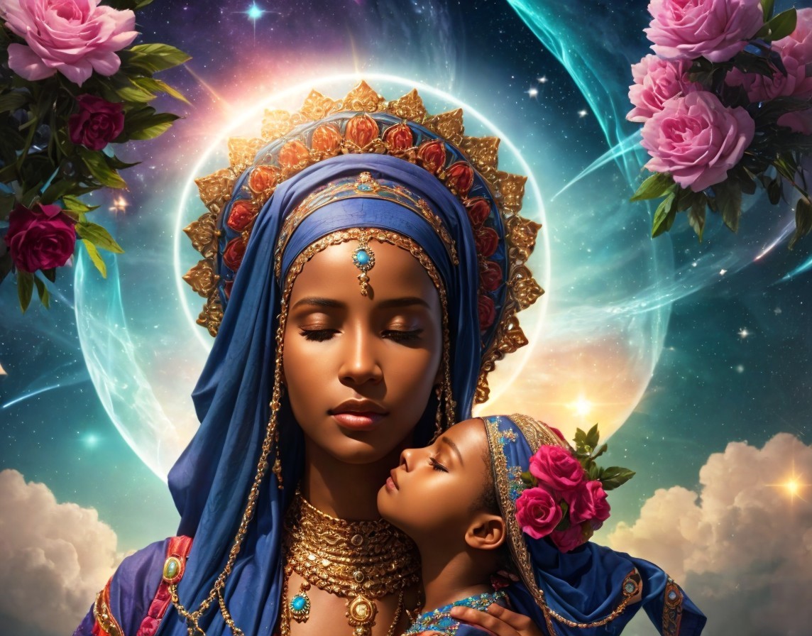 An illustration of a woman with a golden crown and jewelry, draped in blue, surrounded by roses and butterflies against a celestial background.