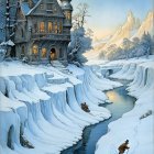 A serene winter landscape features tall, snow-covered trees beside a winding river. Soft blues and whites dominate the scene, with a solitary figure sitting at the water's edge under a bright moon.