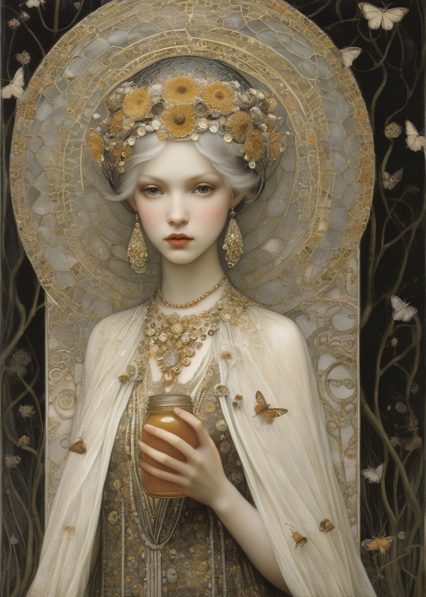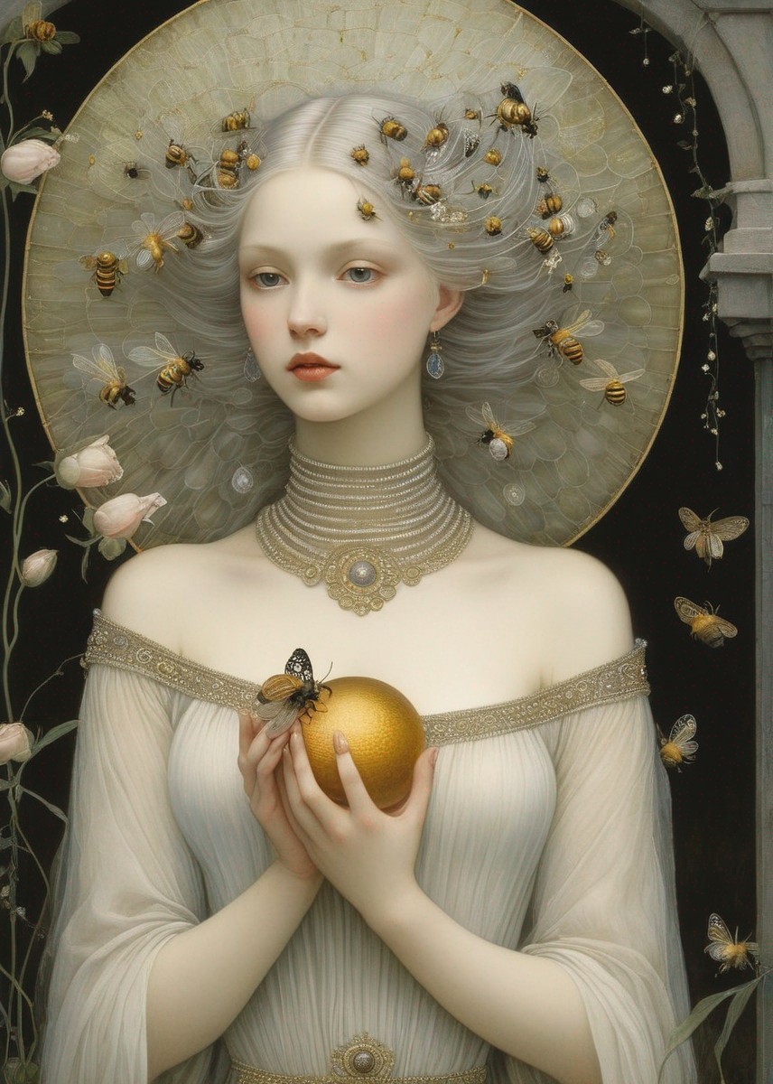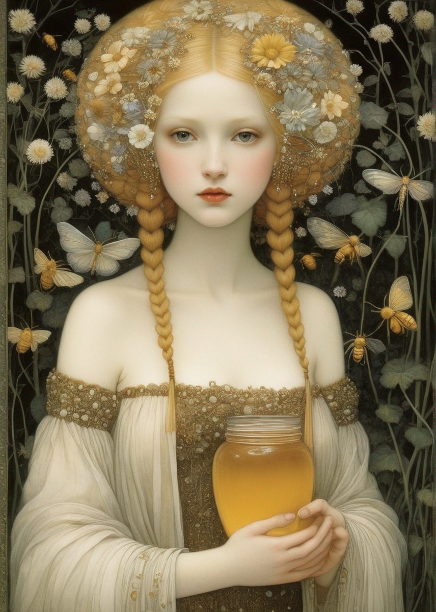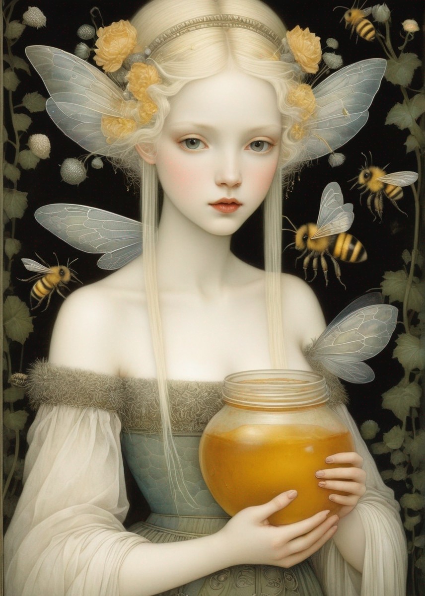 Surreal portrait of fair-skinned woman with butterfly wings, bumblebees, and honey