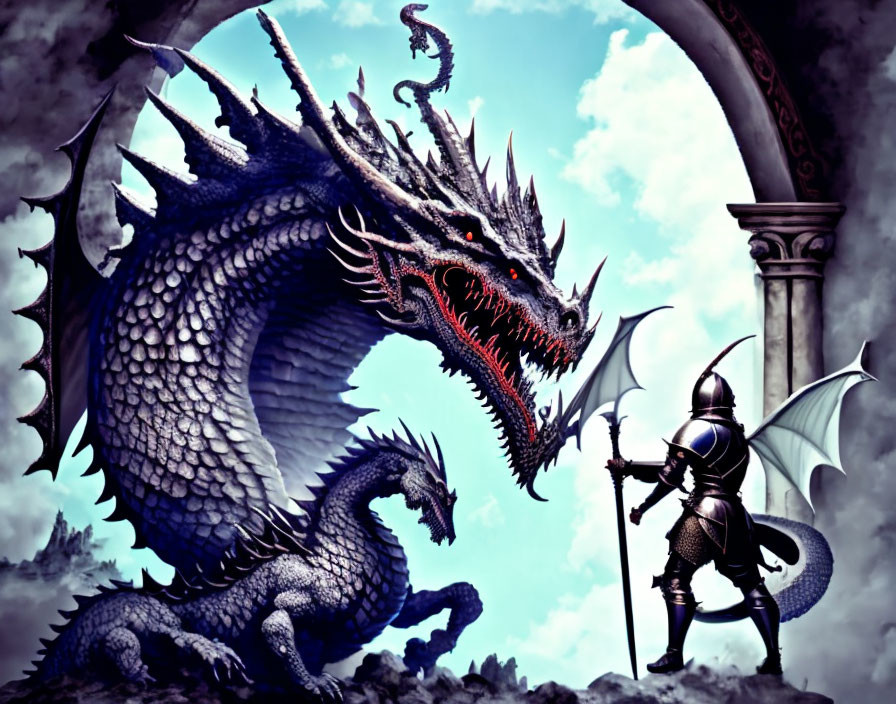 Knight faces large dragon under gothic archway with smaller dragon in dramatic sky