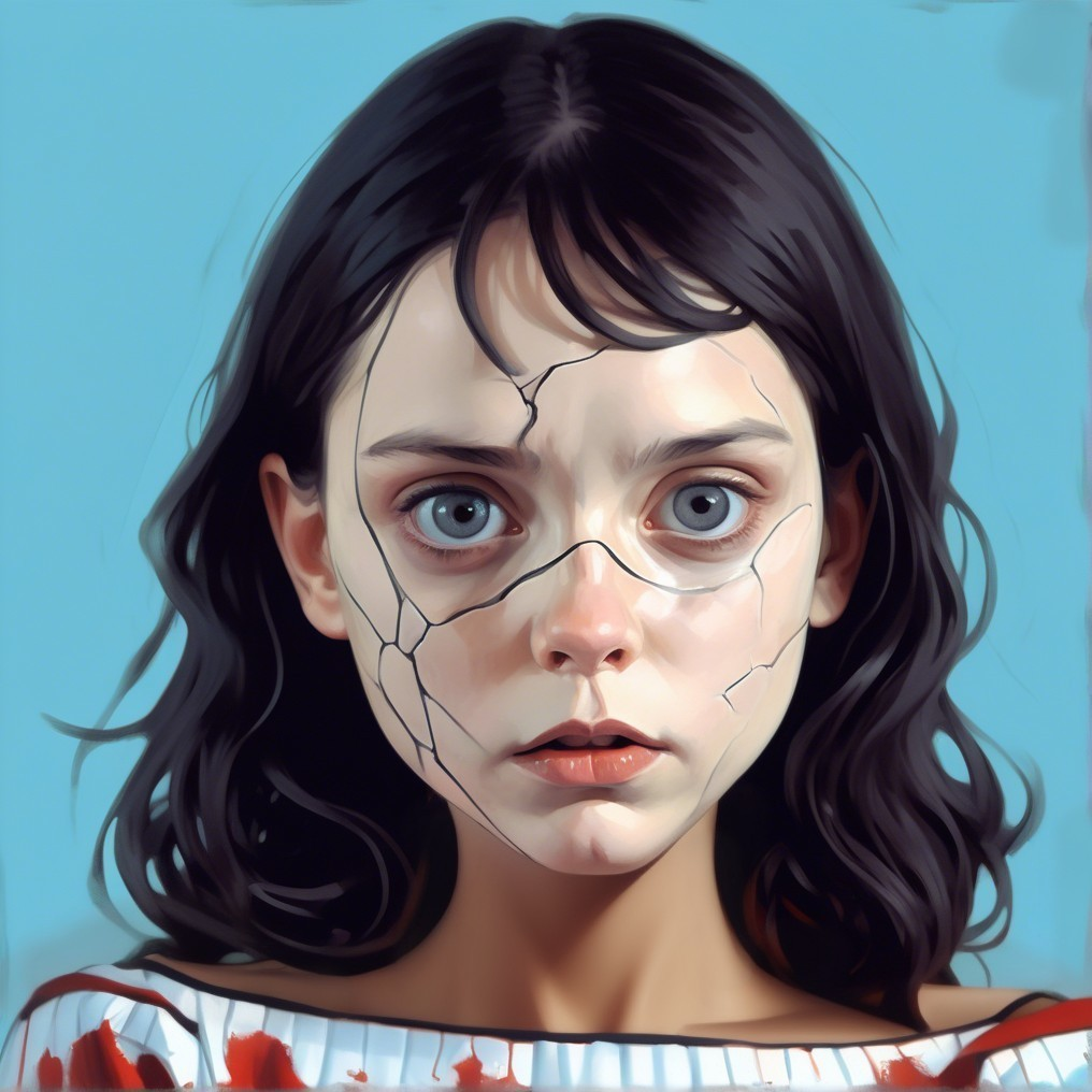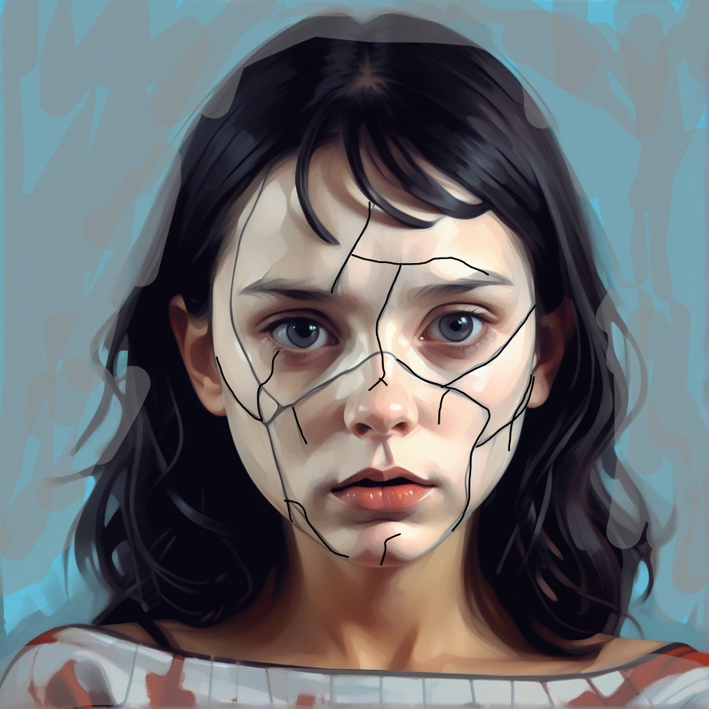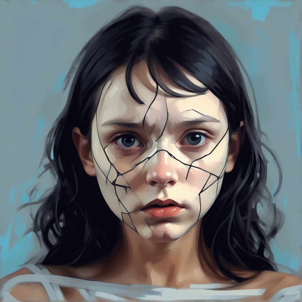 Prompt: Pencil sketch illustration of a girl with cracks forming in her skin, an expression that masks internal anxiety and stress, veins, impasto oil painting, dark, abstract, ominous, style of Dave McKean, Jeremy Mann, Christopher Bucklow and Stephen Gammell
