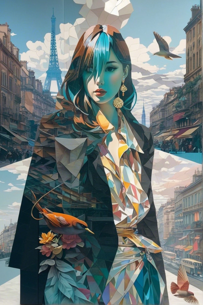 A young woman in a stylish coat stands amidst a cityscape, with butterflies swirling around her. The backdrop features mountains and geometric shapes, merging fantasy with reality.