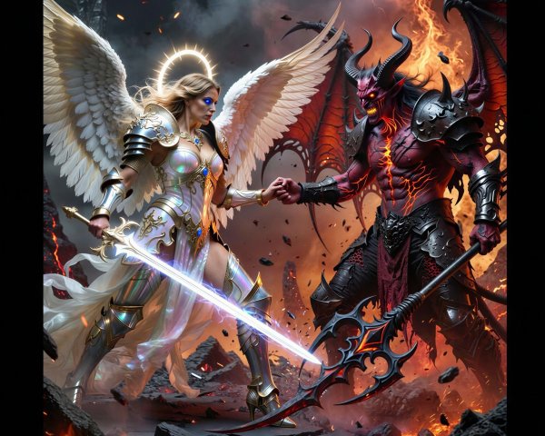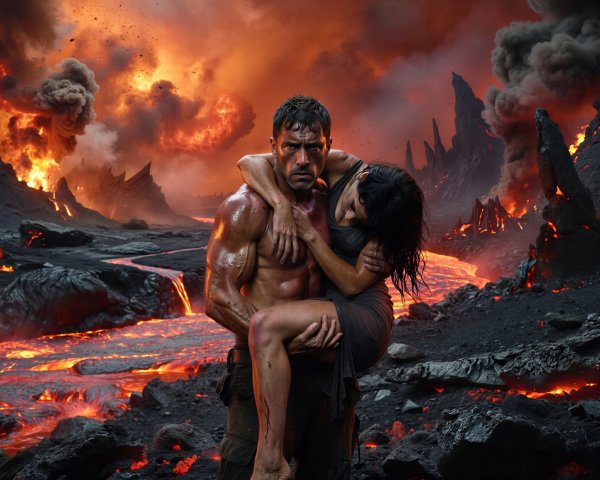 A chiseled and muscular, shirtless man with wet, dark hair and defined facial features, carries a woman with wet, dark hair, disheveled in a grey dress against an apocalyptic landscape of fire and lava. The man stares intently at the viewer, his skin glistening with sweat or water.