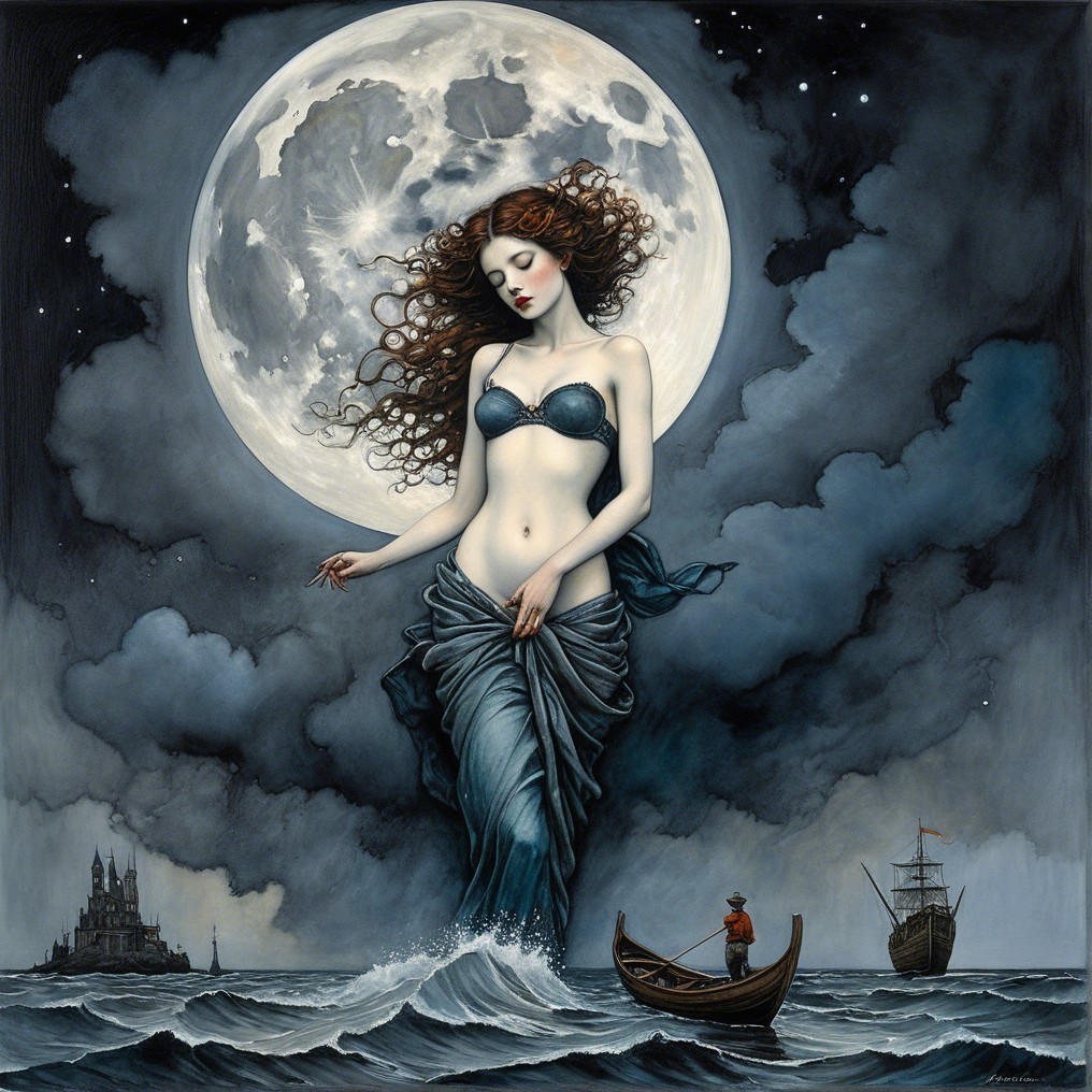 A mystical scene features a woman with flowing red hair surrounded by dark clouds under a full moon. A boy stands on the shore, gazing at the ethereal figure and distant ships.