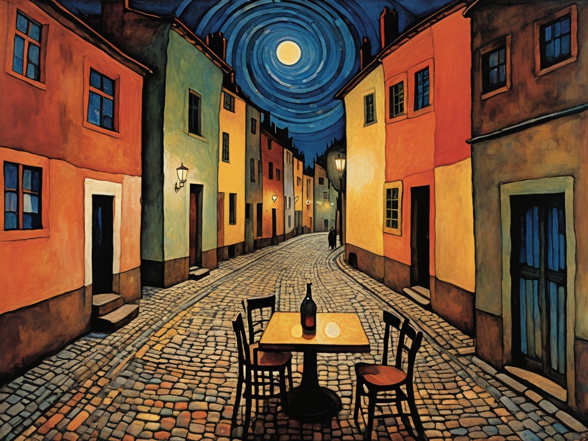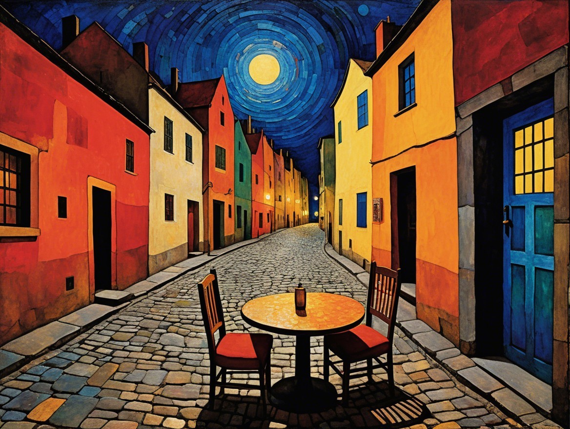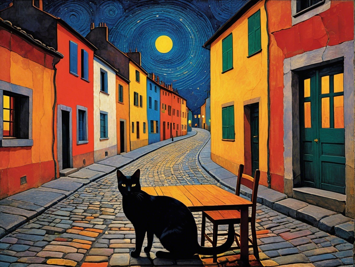 A vibrant, abstract street scene features colorful houses under a bright sun. A black cat sits calmly on a cobblestone path, adding a touch of mystery to the lively surroundings.