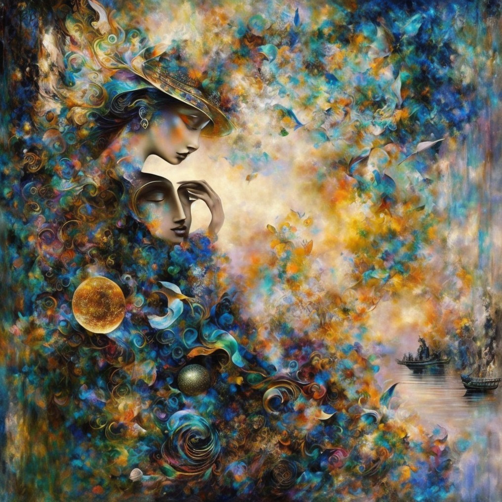 A serene woman with flowing hair adorned with flowers gazes thoughtfully. Surrounding her are vibrant musical notes and colorful blossoms against a twilight cityscape.