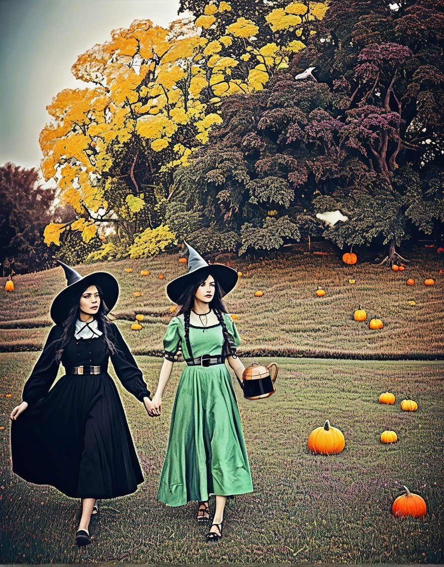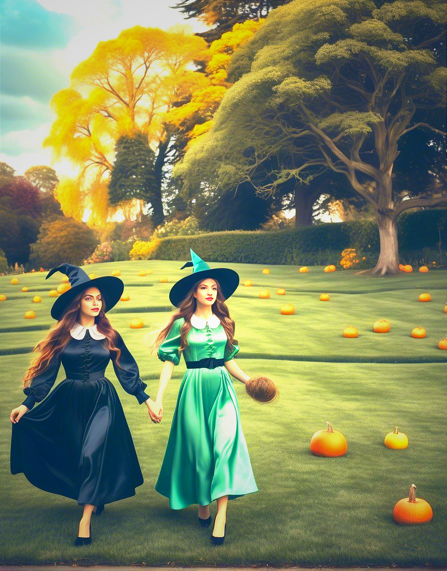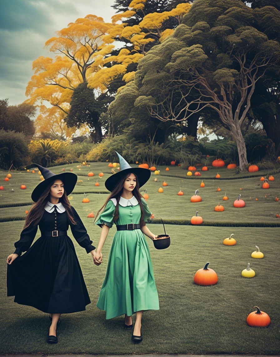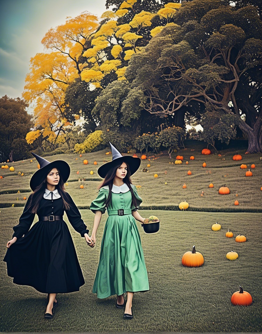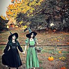 Girls in Green Dresses in a Pumpkin Patch Setting