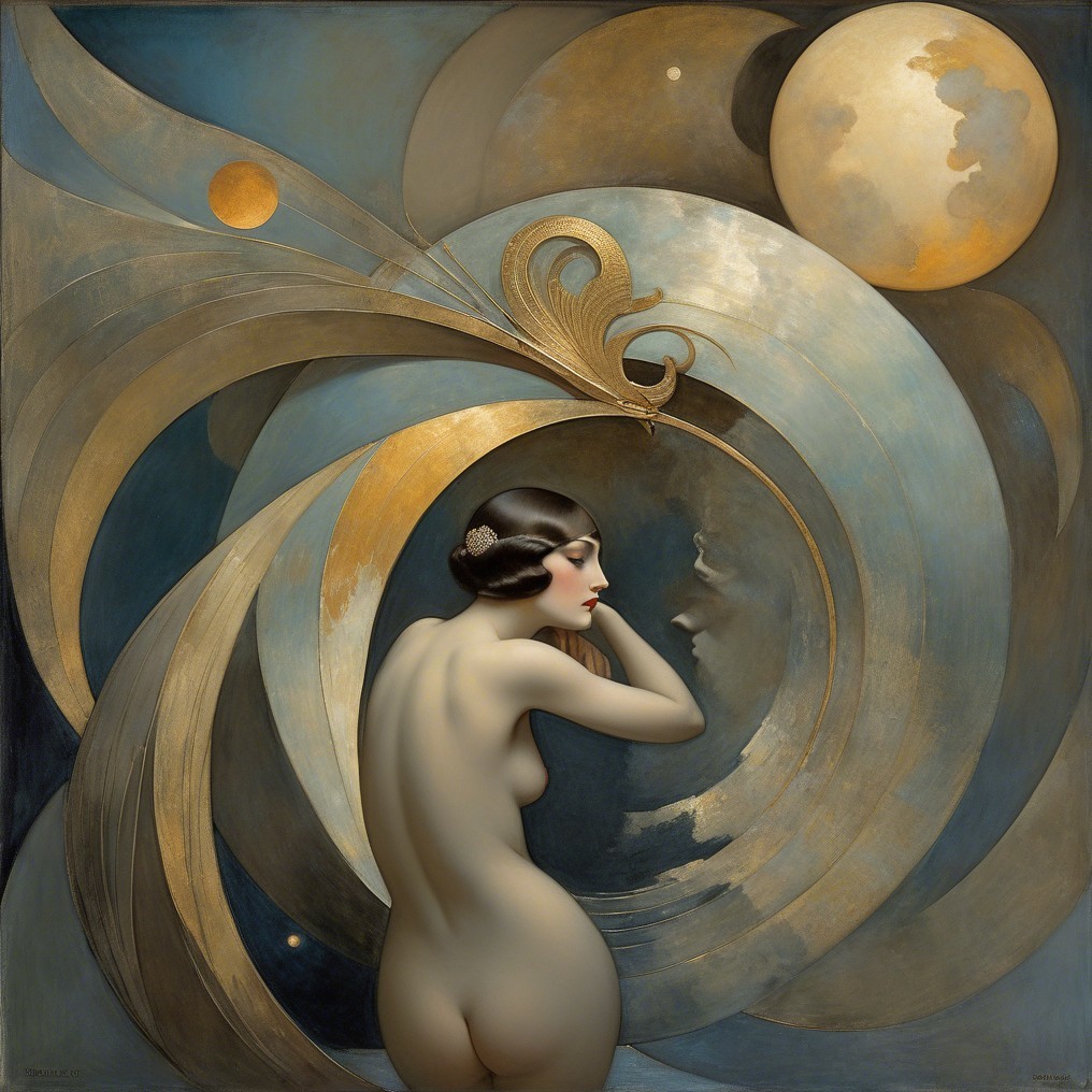 The artwork features a graceful woman in a flowing silver garment, set against a celestial backdrop of swirling clouds and moons, radiating elegance and a dreamlike atmosphere.