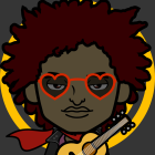 A vibrant illustration of a young woman with a bold red hairstyle, heart-shaped glasses, and a confident smile, holding a small guitar, set against a circular yellow backdrop.