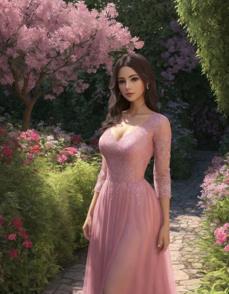 Woman in Pink Lace Dress in Sunlight-Dappled Garden