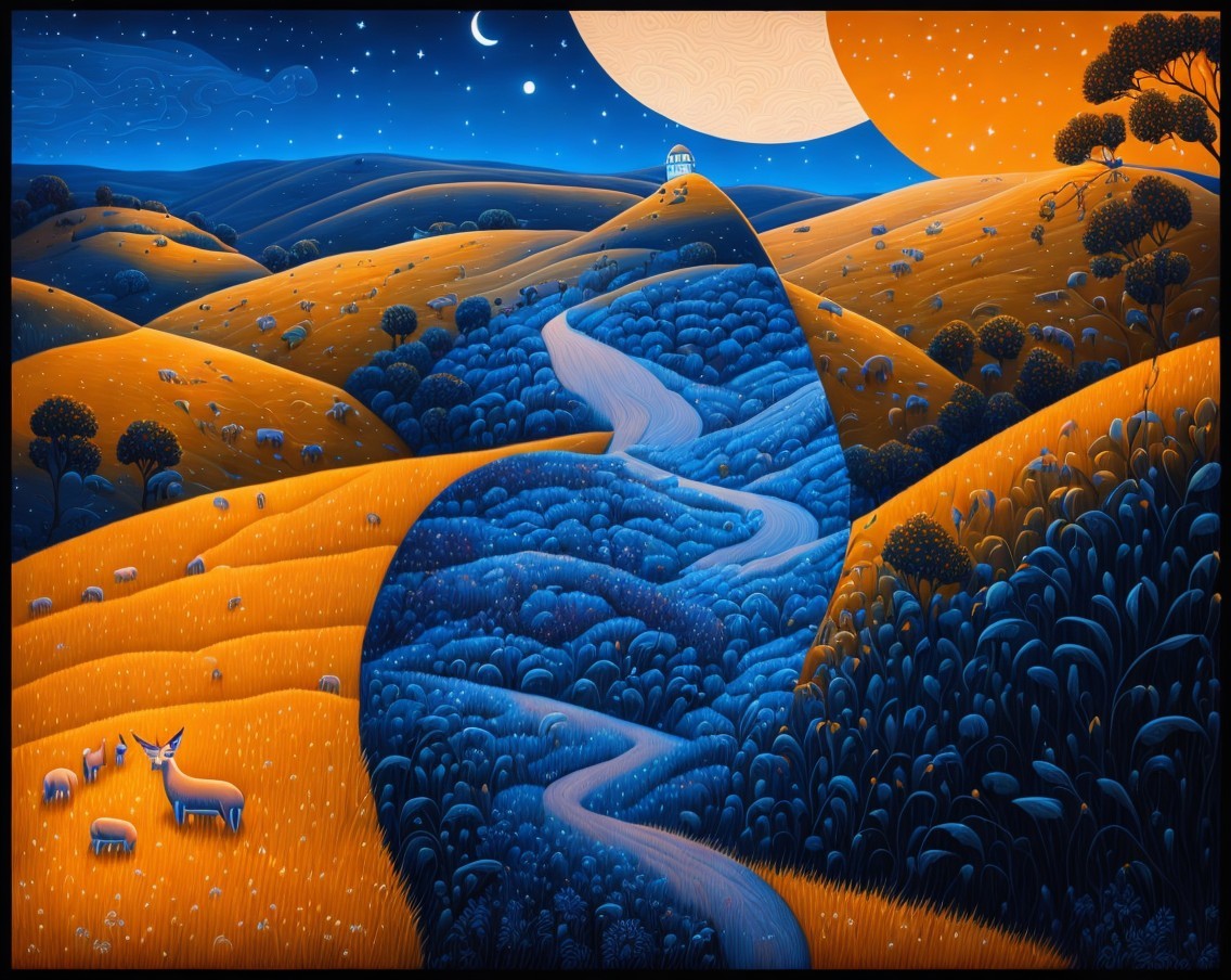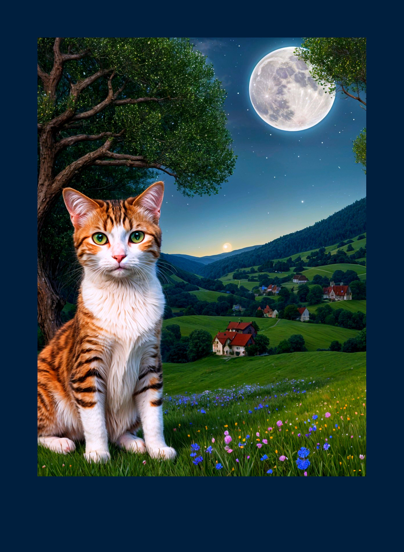 A majestic tabby cat stands gracefully in a golden meadow, illuminated by a warm sunset. Rolling hills bathed in soft light create a serene, enchanting backdrop.