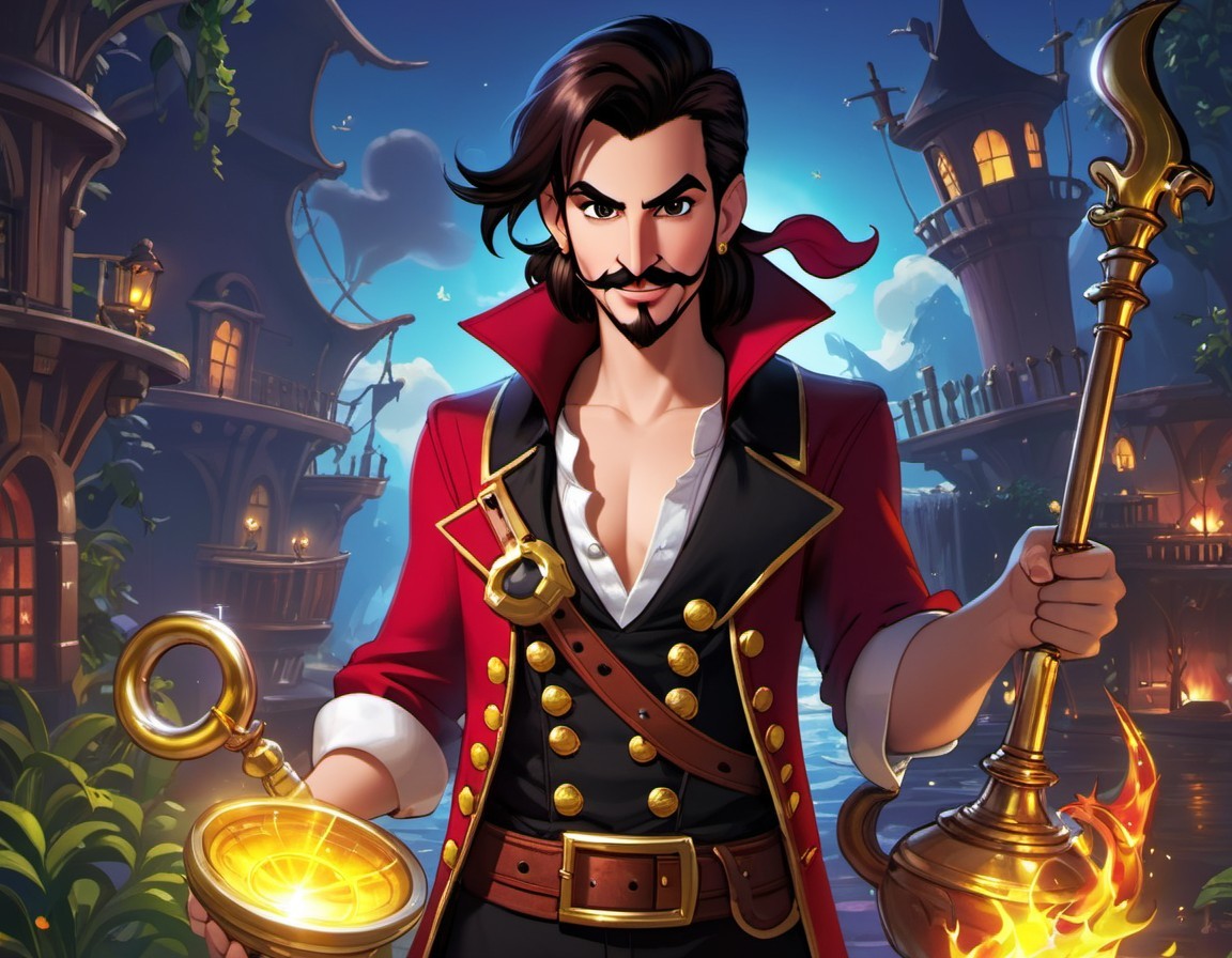 A dashing man in a red coat with a lantern and spyglass stands before a nighttime cityscape.