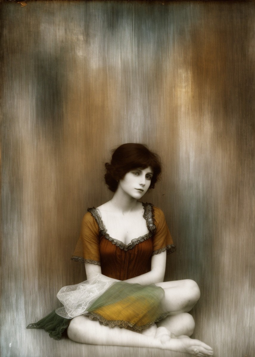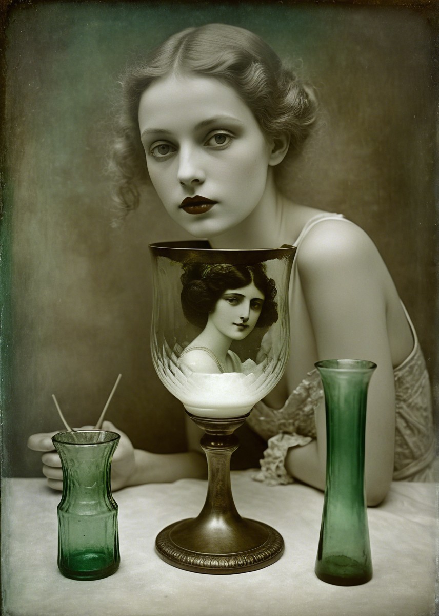 A vintage-inspired portrait features a young woman with lush, curled hair, sitting beside elegant green glassware and a decorative goblet, evoking a mysterious, classic ambiance.