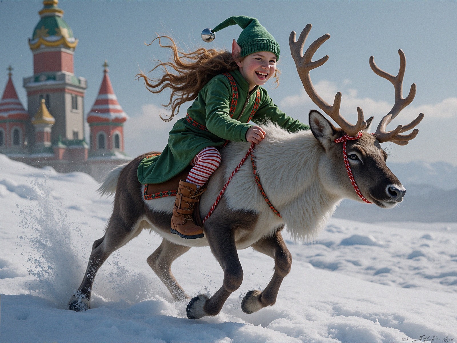 A joyful child in a green elf outfit rides a reindeer through a snowy landscape, with a colorful castle in the background. The scene captures a playful, magical winter moment.