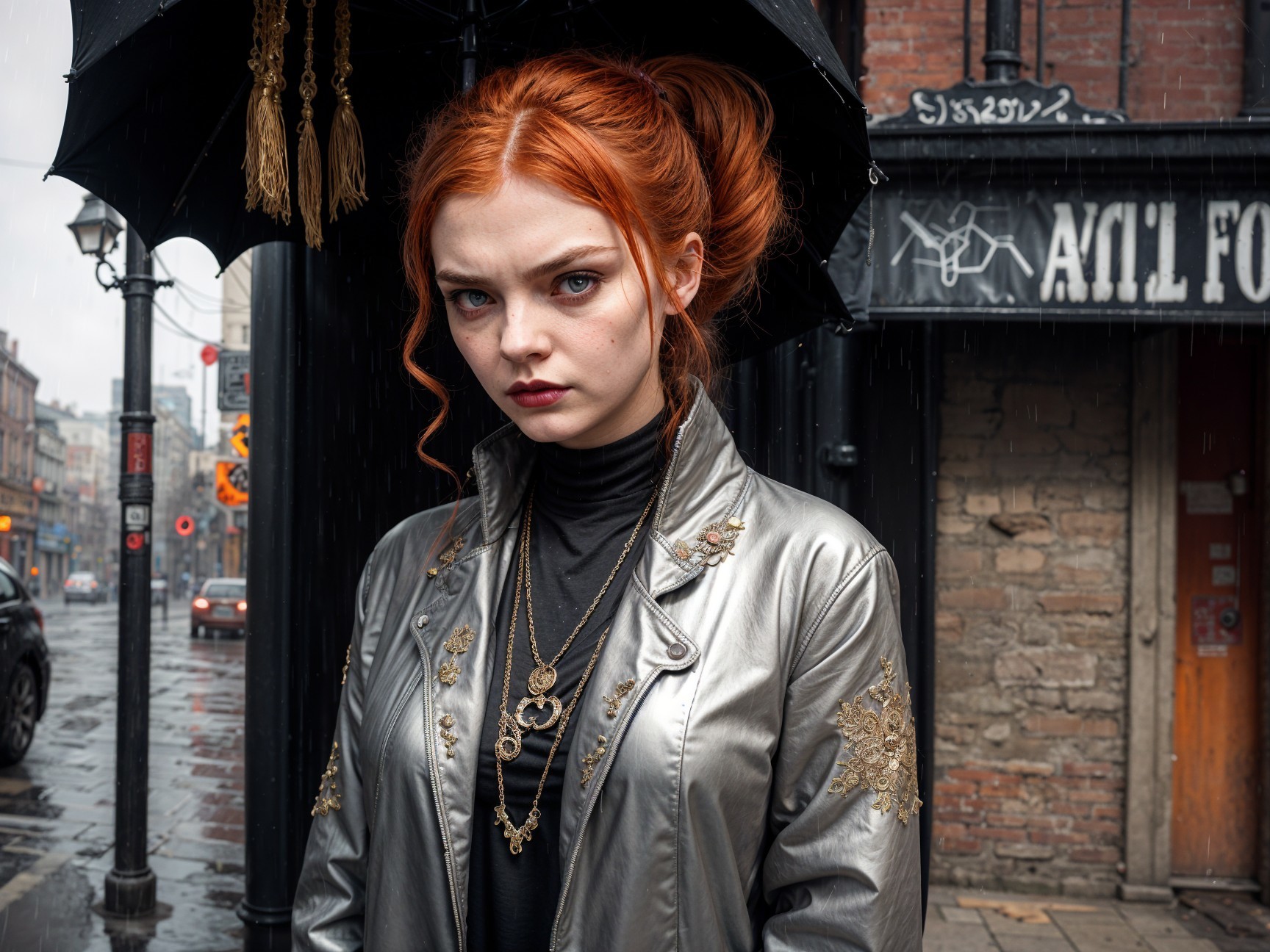 Two stylish figures stand under a black umbrella in the rain. One has striking red hair and silver attire, while the other, in dark clothing, holds a large orange cat. The scene exudes a moody, gothic vibe.