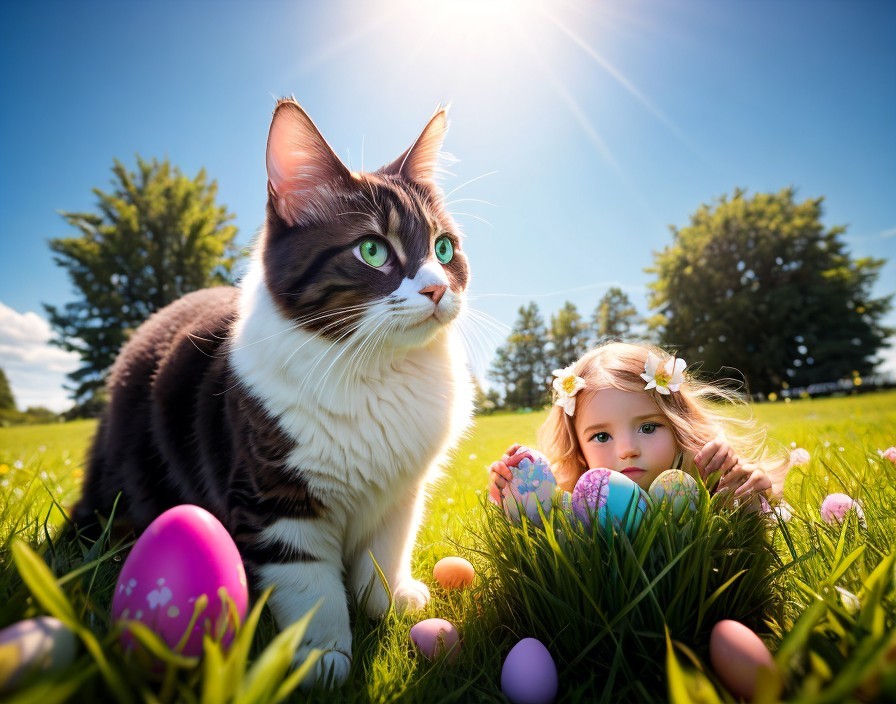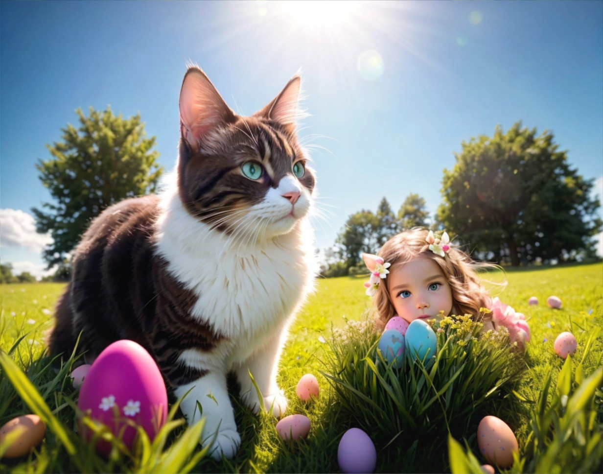 Prompt: "Stunning high-definition photograph of a cute Maine Coone cat and a flower girl exploring for Easter eggs in the lush grass under the bright sun. The beautiful landscape and blue sky add depth to the scene, showcasing the intricate details in an ultra-realistic style."