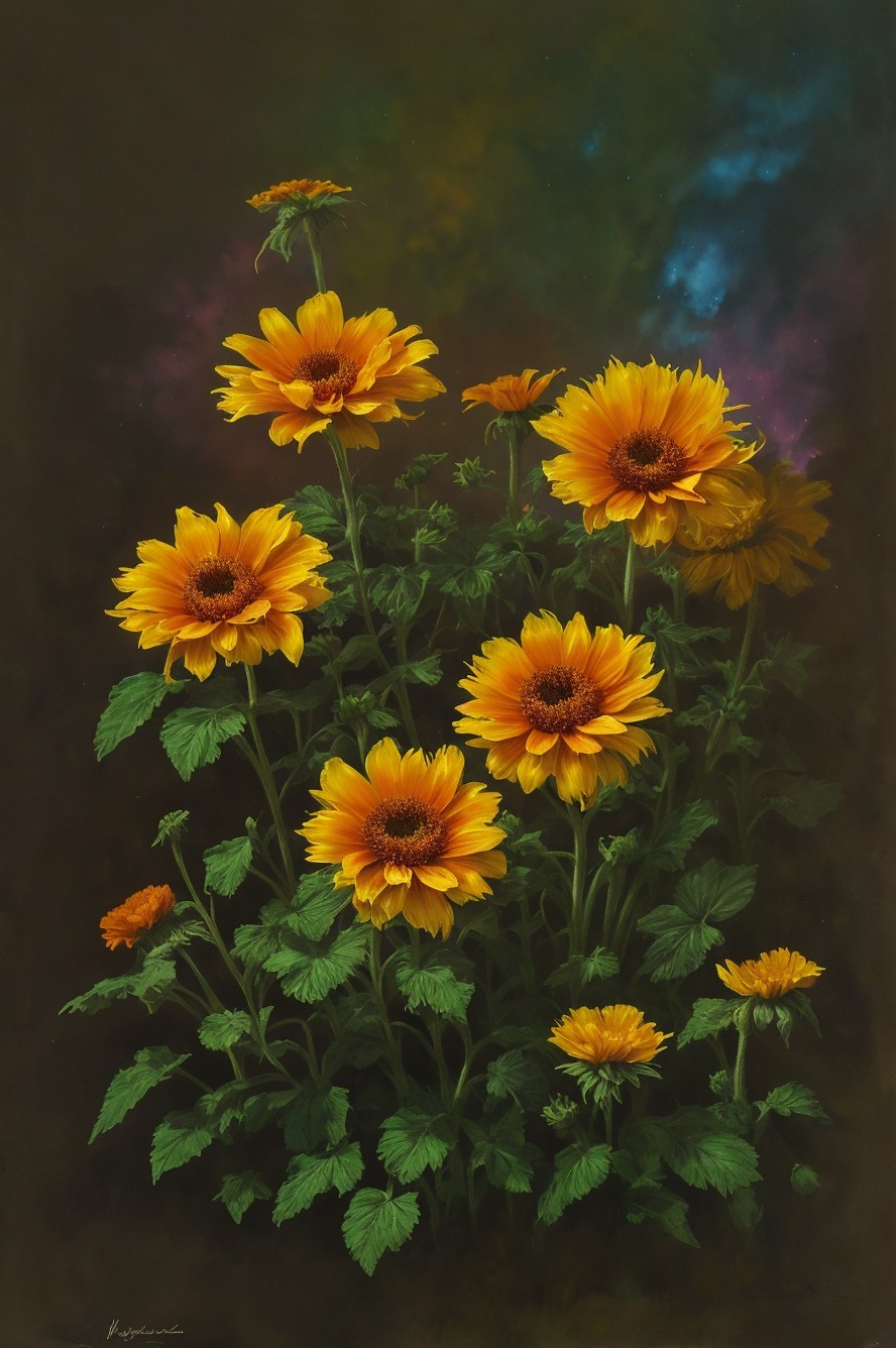 + Prompt:Unreal glowing marigolds and sunflowers, vivid and bioluminescent in the blazing sunshine, flowers in the style of Jean-Baptiste Monge, mystical fumes and mists rising from magic earth