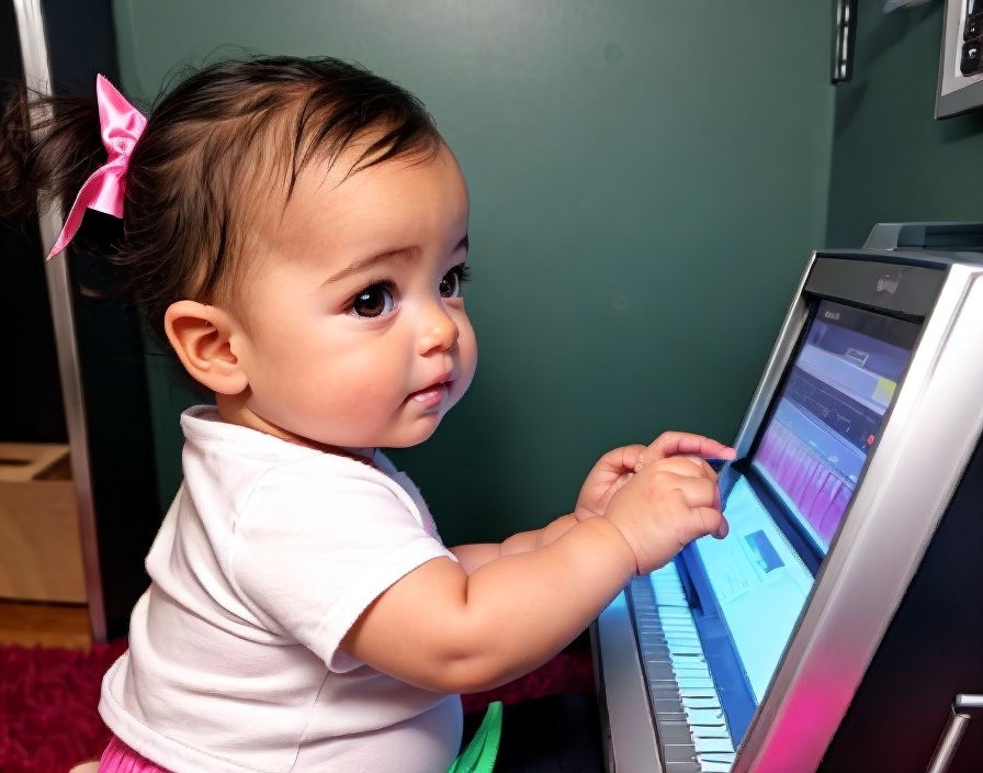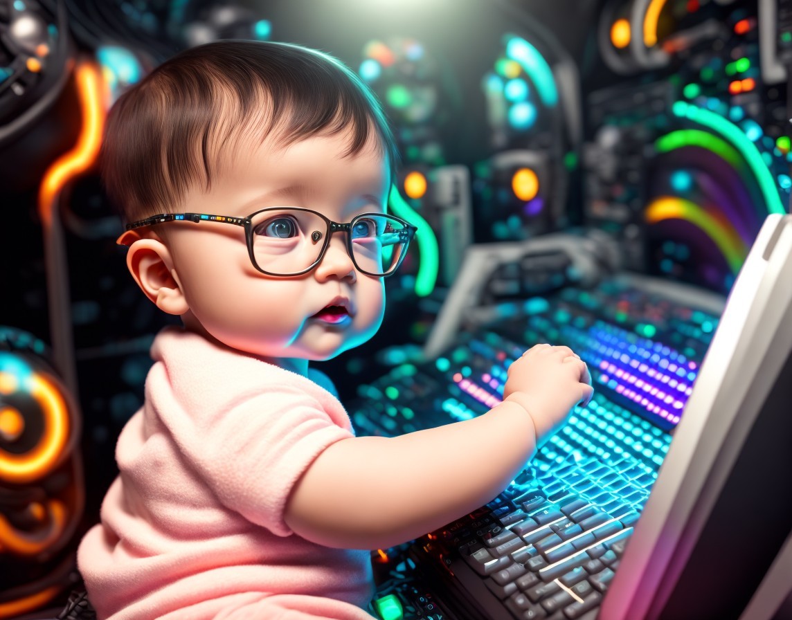 Geek baby programming like crazy chat GPT in an underground computer lab