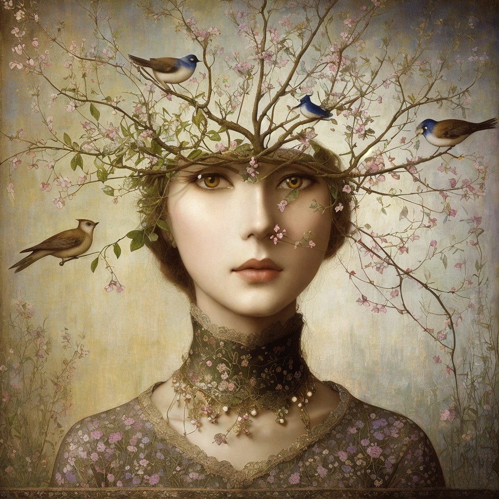 A serene female figure adorned with delicate flowers and birds in her hair, wearing a patterned dress and ornate jewelry, set against a dreamy, soft background of subtle architecture and nature.