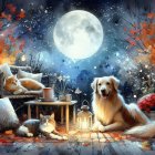 A cozy night scene features a golden retriever and two cats on a wooden deck, surrounded by colorful autumn leaves and flowers, under a glowing full moon and starry sky.