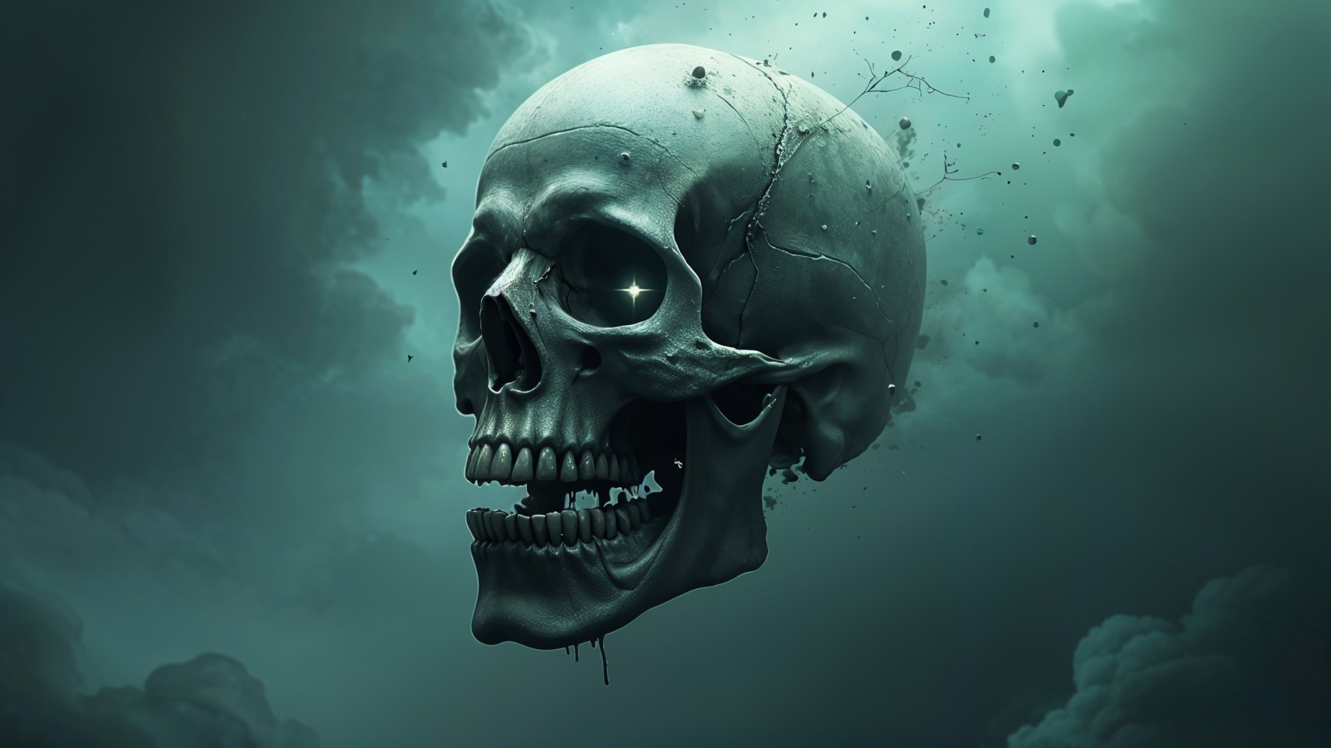 A haunting skeleton with branches emerging from its skull stands in a desolate, eerie landscape, illuminated by a ghostly moonlight under a stormy sky. Shadows and twisted trees enhance the atmosphere.