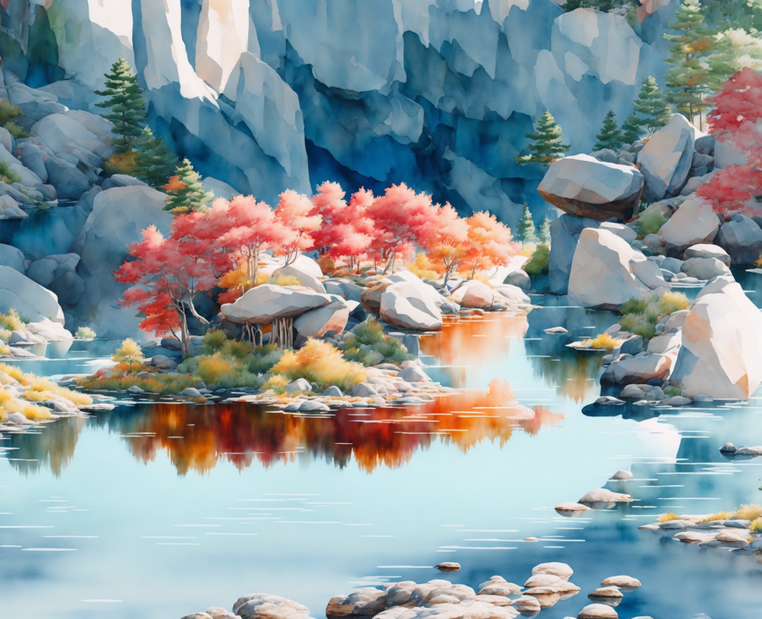 A rich colours and harmonious design. a distinct rotunda, three stories, a lake, rocks, trees, blue sky, plenty of sunshine, watercolour, intricate detailed, coloured, multicolour,