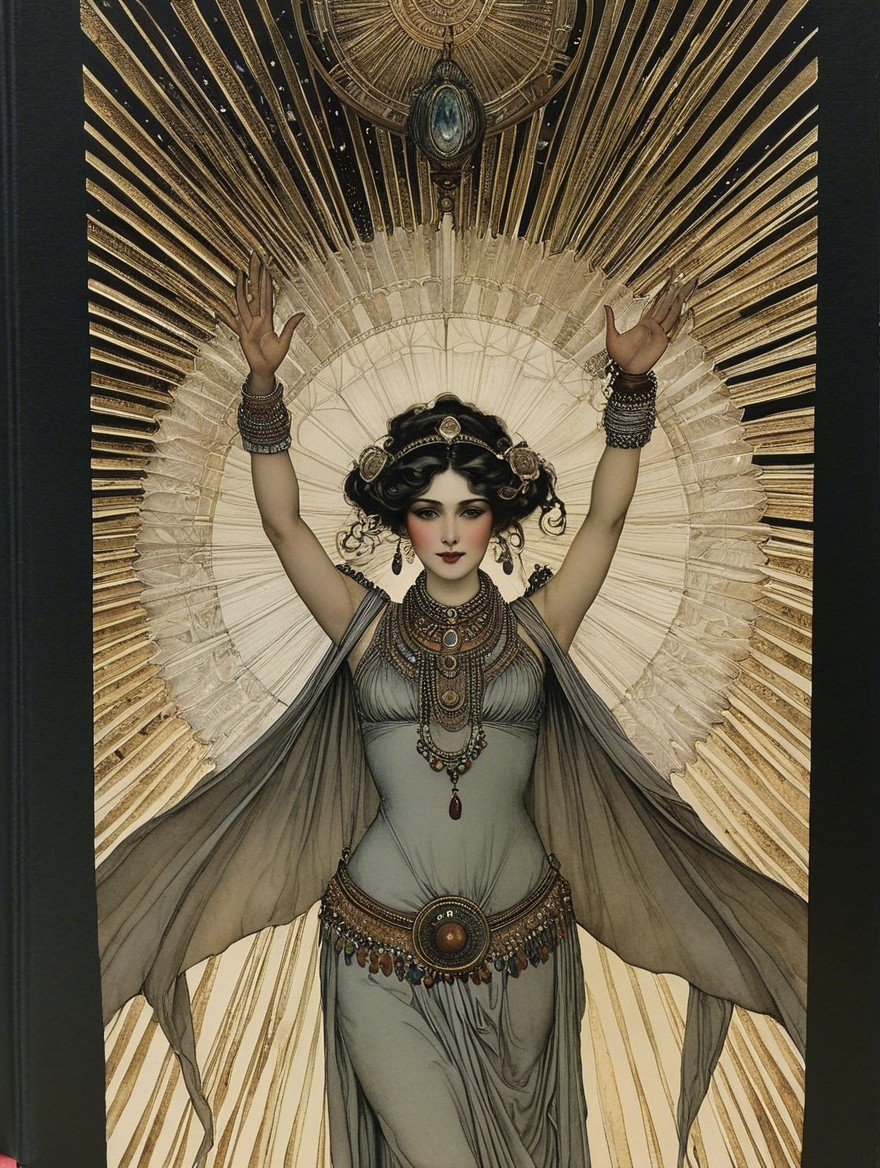 A glamorous woman with flowing, dark curls adorned with flowers. She wears an elegant black gown and intricate jewelry, holding a delicate flower, set against a decorative backdrop.