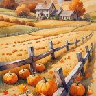 A tranquil autumn landscape features a winding dirt road leading to charming cottages surrounded by golden fields and vibrant fall foliage, under a bright blue sky with soft clouds.