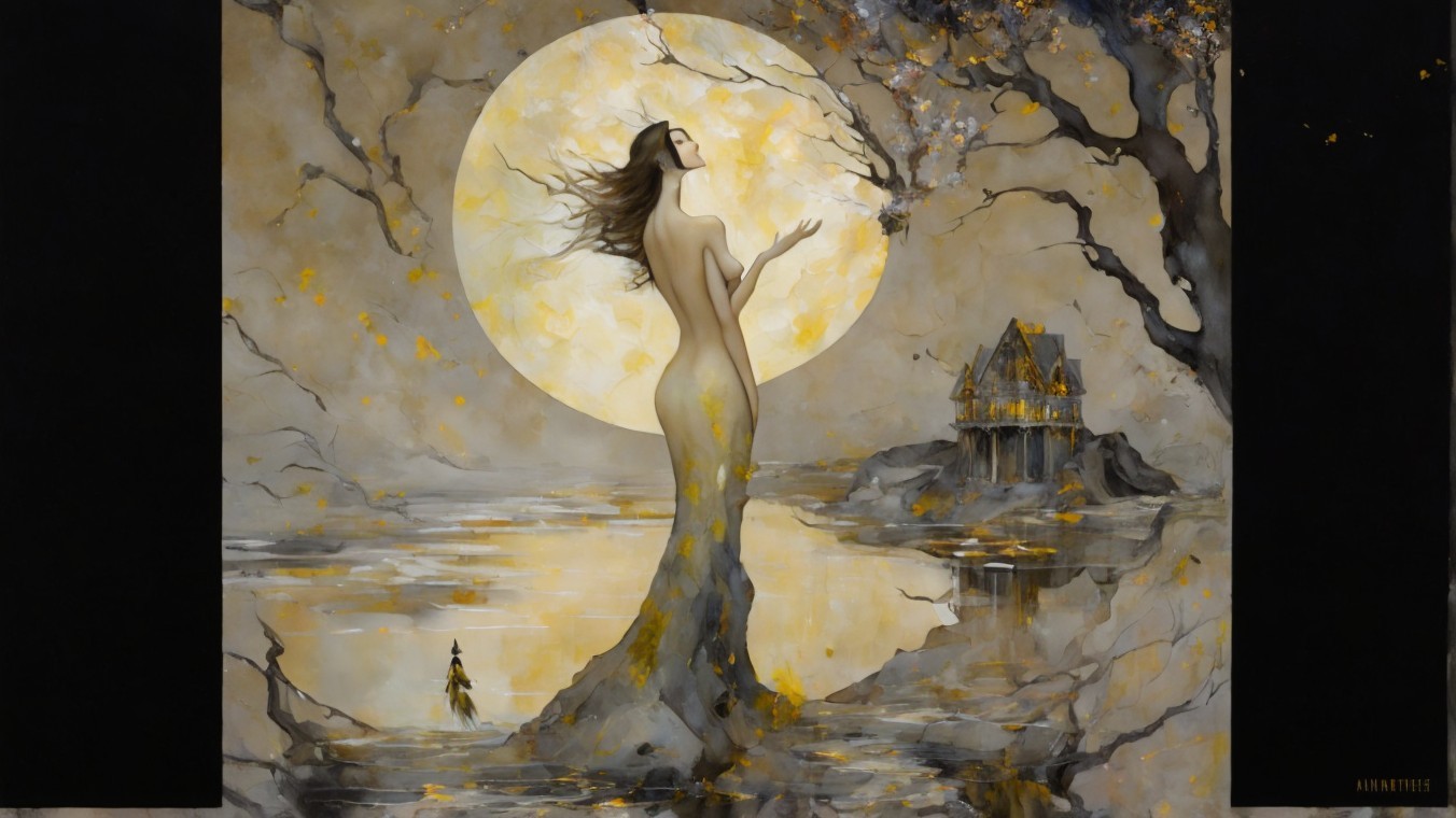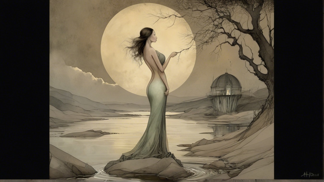A serene figure in a flowing green dress wades in still waters, with a full moon illuminating the scene. A barren tree and distant mountains complete the tranquil, ethereal atmosphere.
