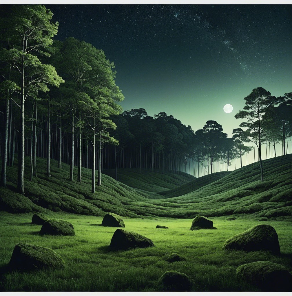 A serene, ethereal woman draped in flowing green fabric stands under a glowing full moon, surrounded by lush trees and a tranquil river, evoking a sense of mystery and natural beauty.