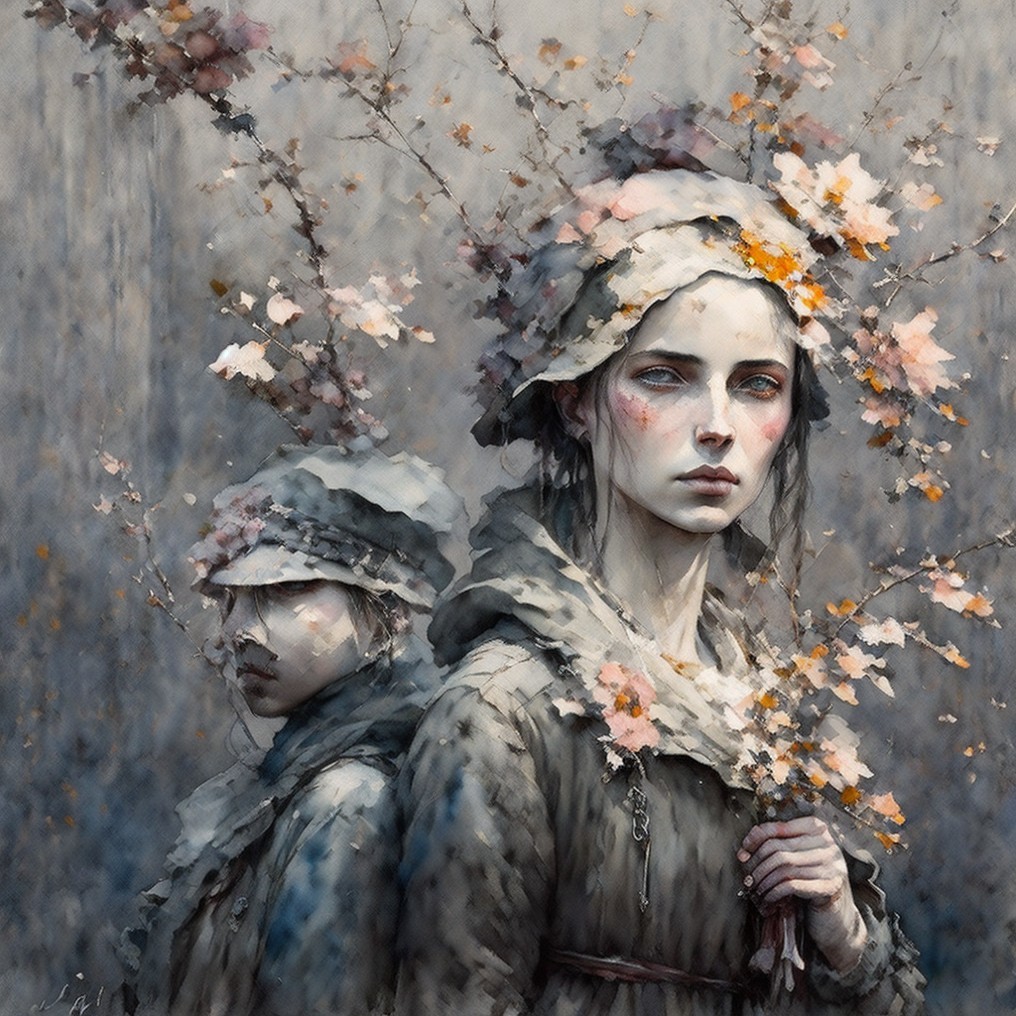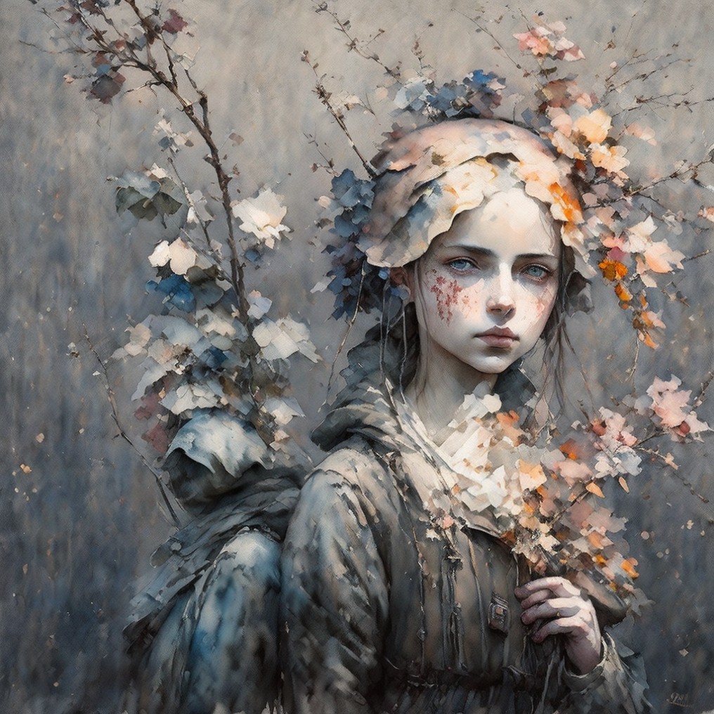 A serene portrait of a young woman adorned with a headscarf and flowers, set against a soft, abstract background. Her expression is contemplative, evoking a sense of tranquility and grace.