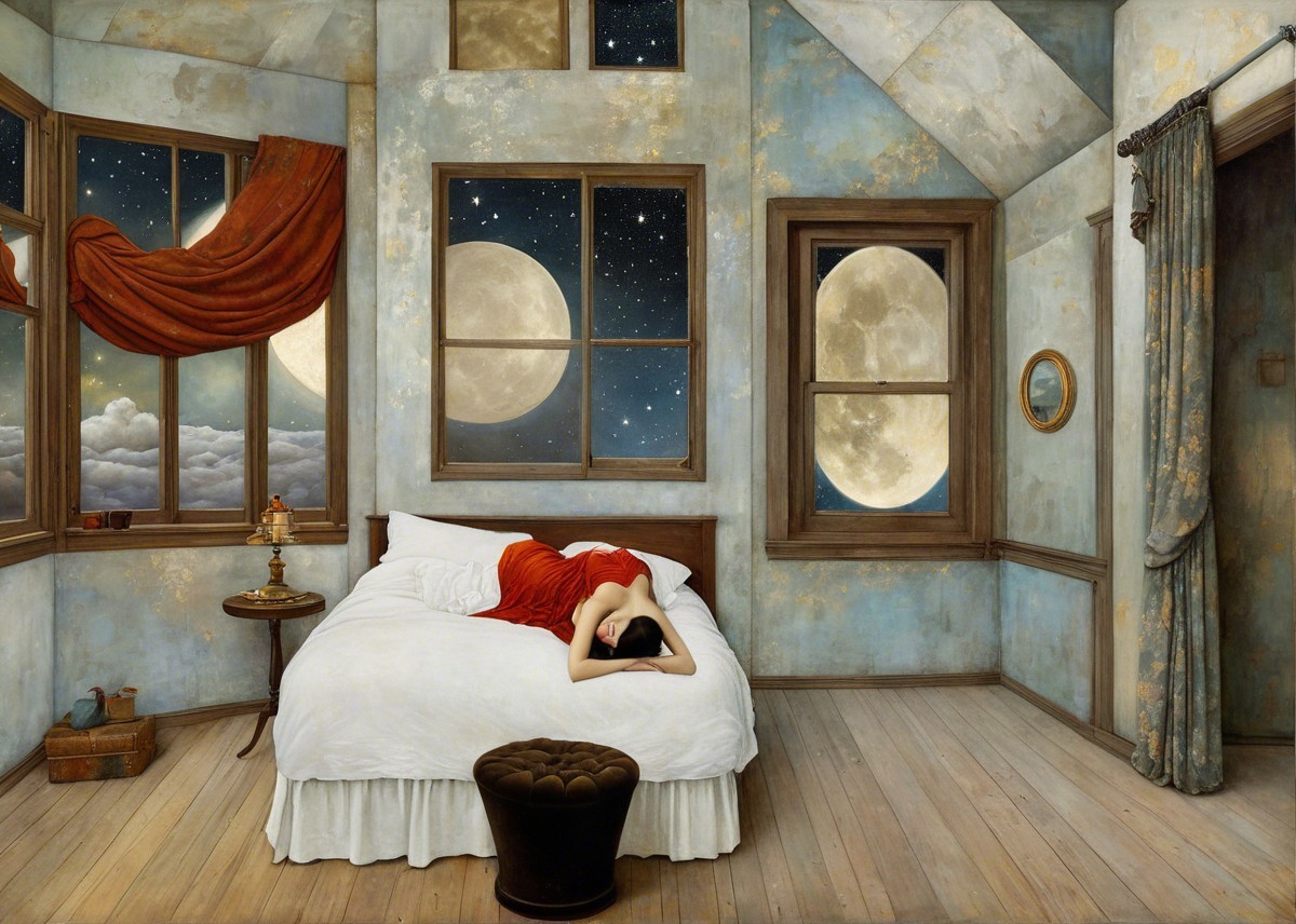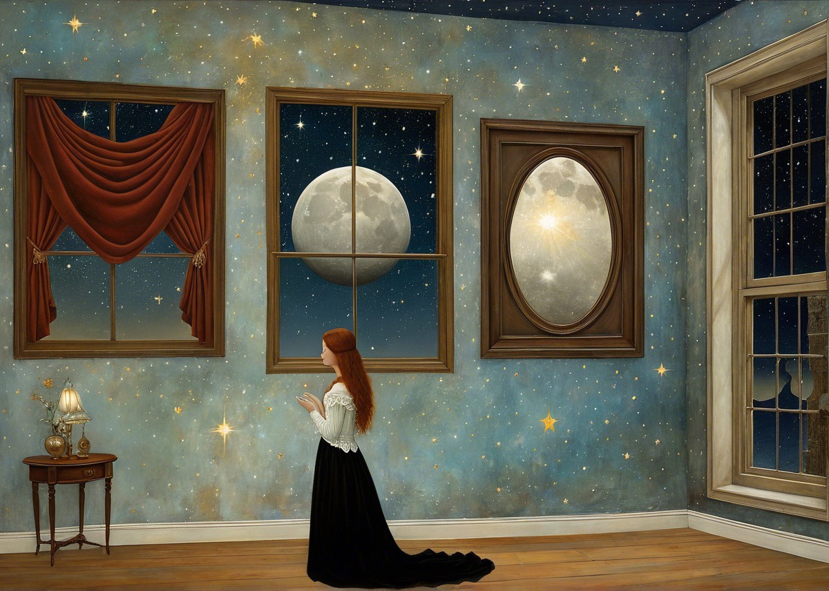 A serene bedroom features a night sky mural with stars and a glowing moon, framed by ornate walls and a wooden floor. A cozy bed, nightstand, and mirrors enhance the dreamlike atmosphere.